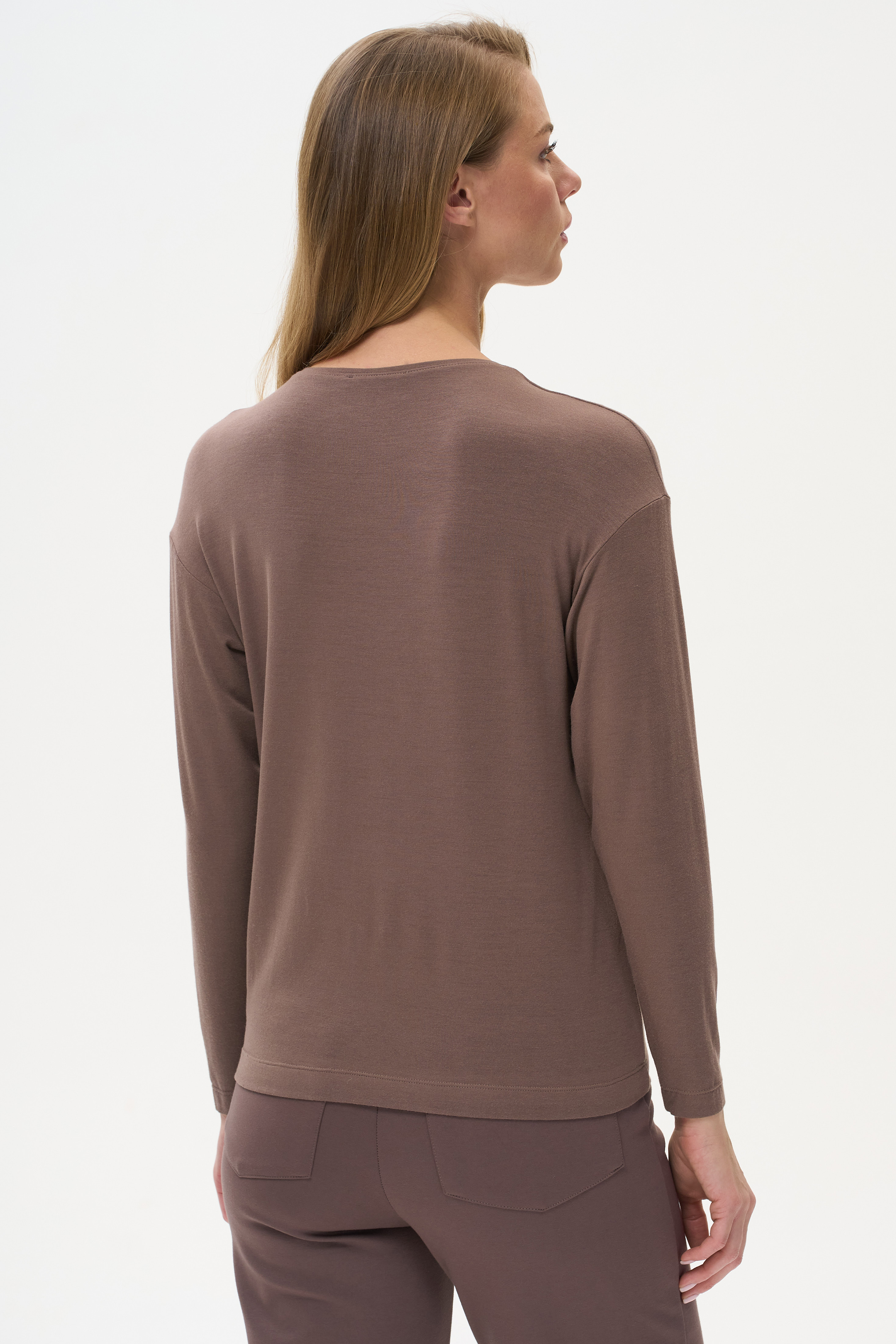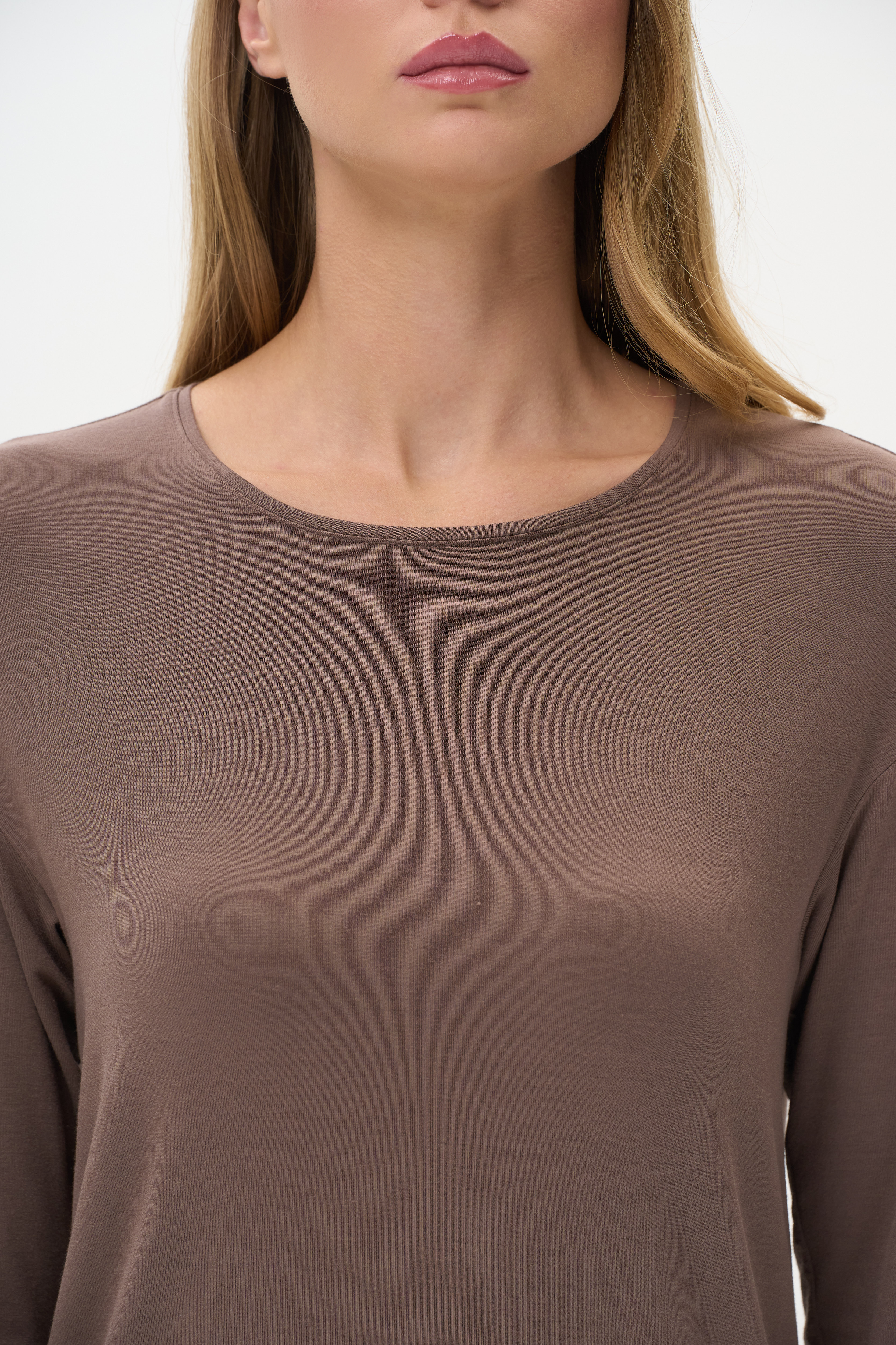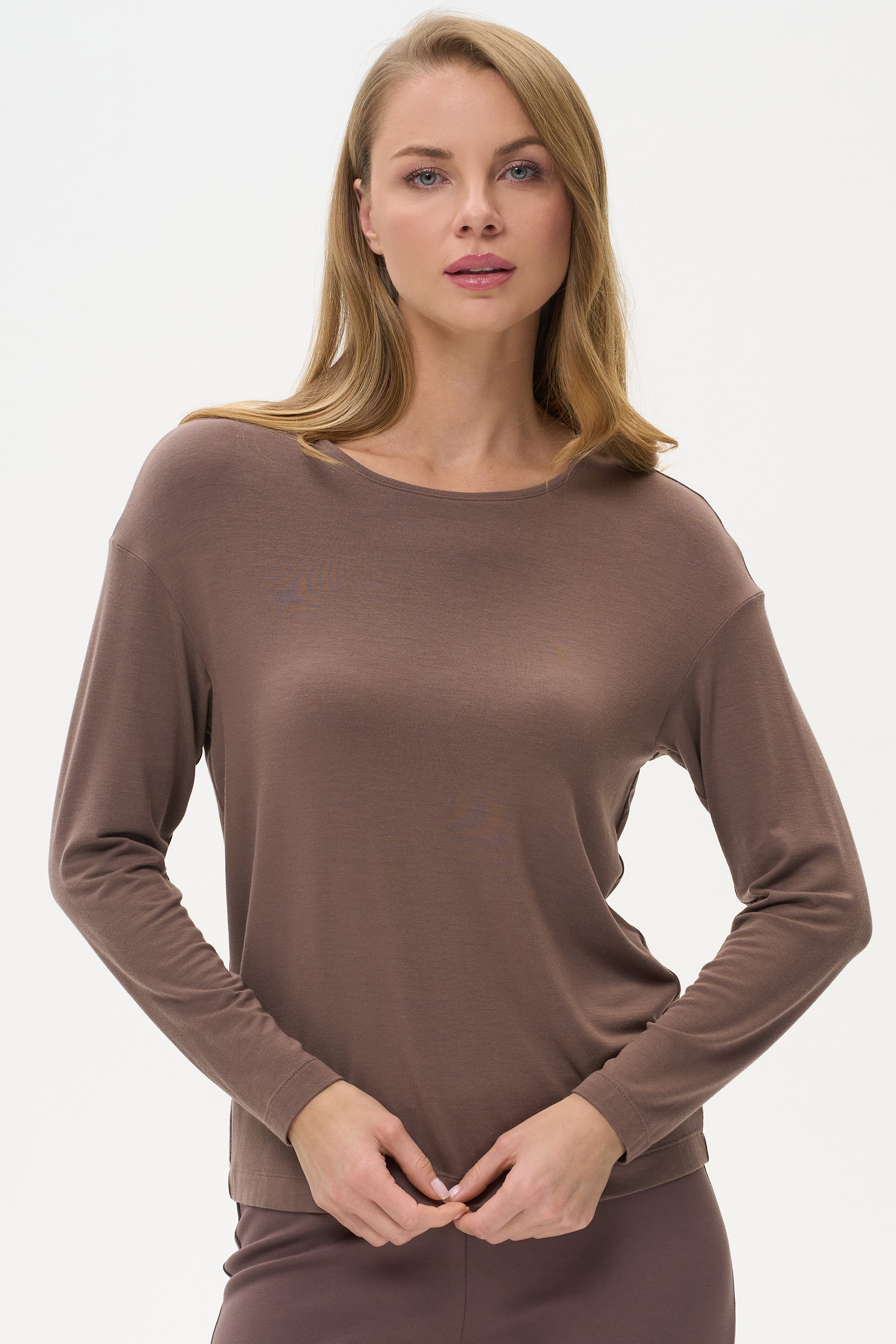 96% модал, 4% эластан Комфортный лонгслив из вискозного трикотажного полотна - модал (экологически чистая ткань нового поколения). Прямого силуэта с длинными втачными рукавами и круглой формой горловины. Рост модели 178 см