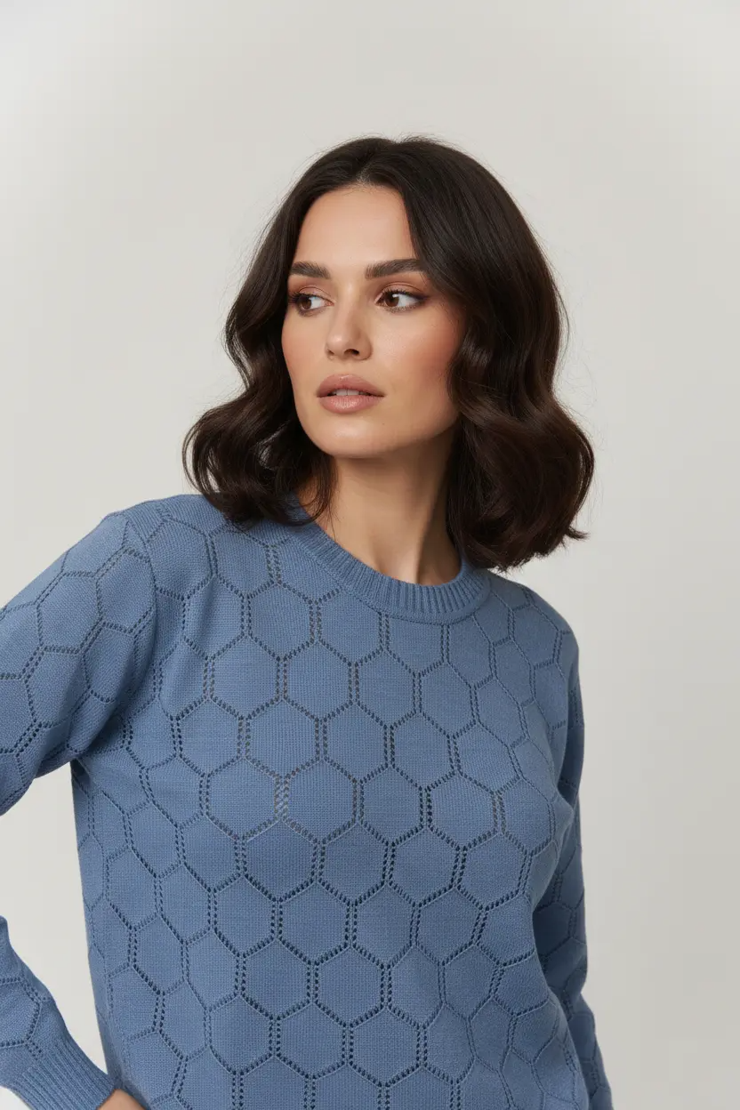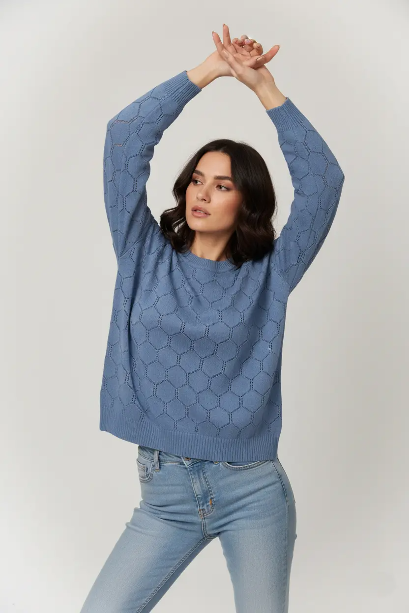 Ажурный женский трикотажный джемпер свободного силуэта. Плечо спущенное, рукав длинный. Вырез горловины круглый. Джемпер выполнен ажурным переплетением, горловина, низ изделия и проймы рукавов обработаны эластичным переплетением.