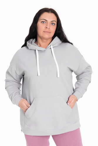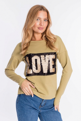 Джемпер выполнен из футер петли с лайкрой цвета хаки. С длинным спущенным рукавом, горловина лодочкой, низ с перепадом длины. Спереди декоративная нашивка с пайетками.
