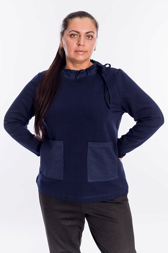 Джемпер выполнен из футер петли с лайкрой. Спереди расположены накладные карманы. Детали воротника, карманов, бейки-завязки выполнены из отделочного полотна с люрексом.