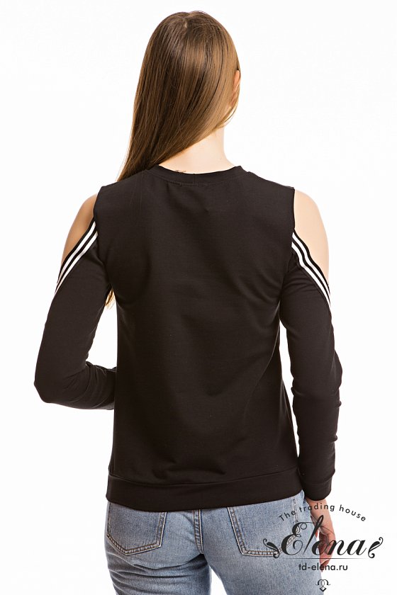 Молодёжный джемпер из футер петли с лайкрой. С длинным втачным рукавом на манжете, с притачным поясом и круглым вырезом горловины. Отделкой в джемпере являются открытые участки рукавов на плечах, оформленные лампасной тесьмой.