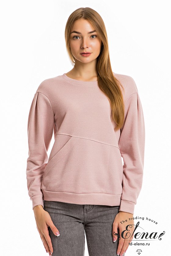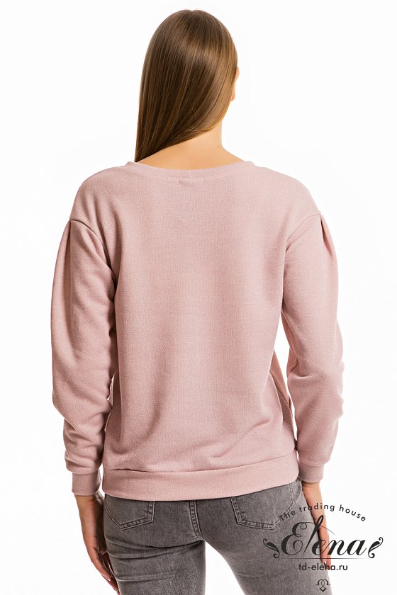 Джемпер выполнен из футер петли с люрексом. Спереди расположен карман. На рукавах, в шве проймы, заложены складки, низ рукавов и изделия оформлены манжетами и поясом. Горловина с притачной планкой.