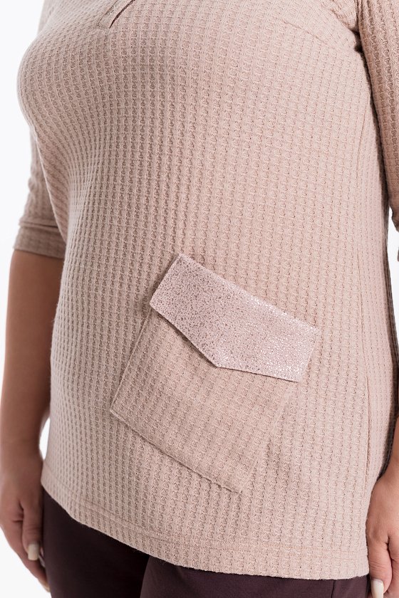 Джемпер из однотонной рибаны "клетка". С втачным рукавом длиной 3/4. Спереди расположен карман. На кармане и воротнике джемпера вставки из отделочного полотна.