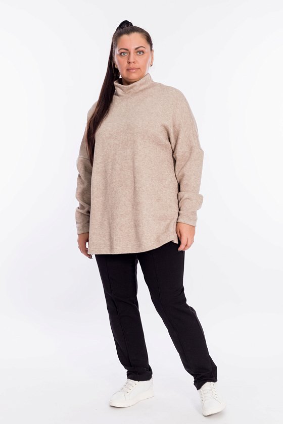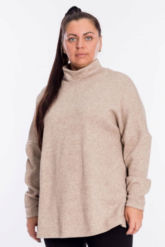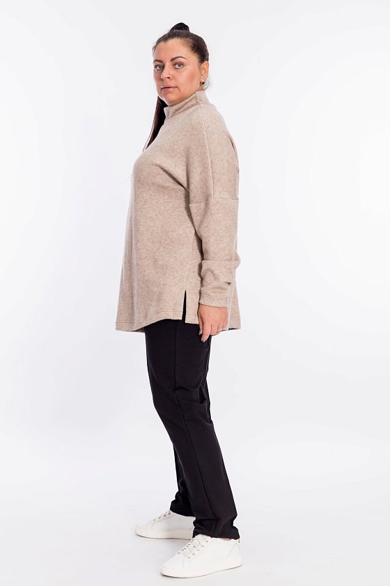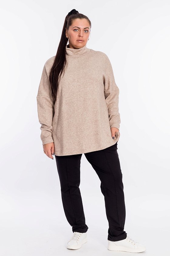 Женский джемпер с высоким воротником выполнен из полотна "ангорка". Силуэт свободный, линия плеч спущена, внизу, по бокам изделия декоративные разрезы. Невероятно мягкий и тёплый джемпер - идеальный выбор в прохладное время года, легко впишется в повседневный гардероб.