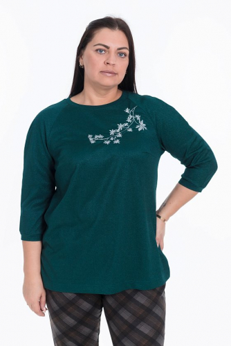 Зеленый джемпер свободного кроя с рукавами реглан и выточками по бокам — идеальный вариант для создания повседневного образа. Длина рукава 3/4 и круглый вырез горловины обеспечивают комфорт, а вышивка на груди и материал с люрексом добавляют изысканности.