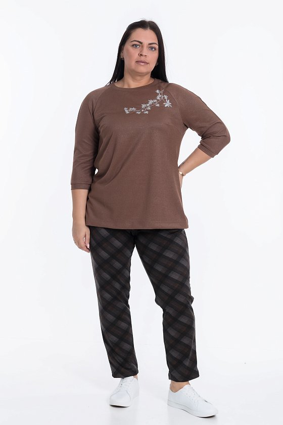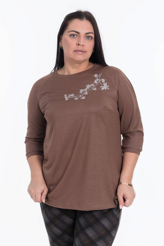 Коричневый джемпер свободного кроя с рукавами реглан и выточками по бокам — отличный выбор для создания уютного образа. Длина рукава 3/4 и круглый вырез горловины обеспечивают удобство, а вышивка на груди и материал с люрексом придают изысканность.