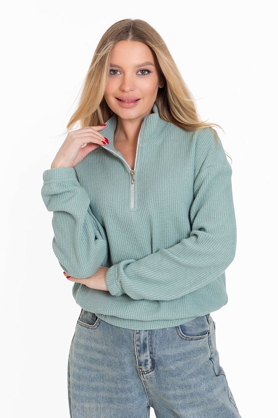 Женский джемпер выполнен из мягкого и тёплого вязаного полотна цвета ментол. Эта модель имеет спущенную линию плеча, что придаёт изделию оригинальность и свободу движений. Воротник-стойка с застёжкой на молнию обеспечивает дополнительный комфорт, а резинка по низу джемпера гарантирует удобную посадку и сохраняет тепло. Такой джемпер станет стильным элементом вашего гардероба и подойдёт для создания разнообразных образов.