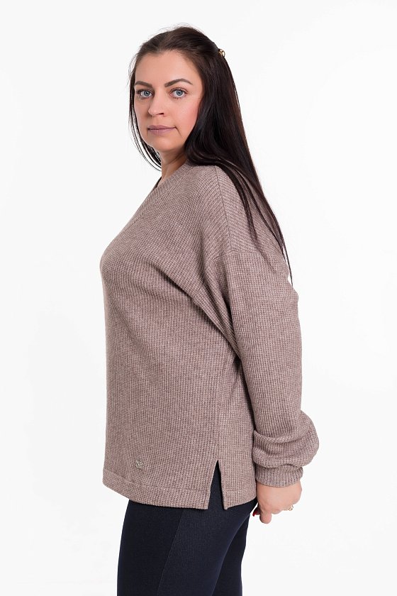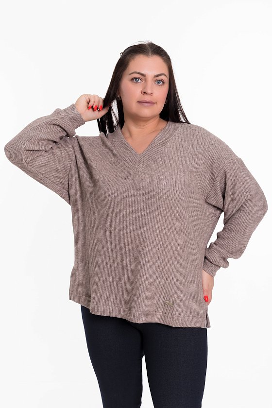Джемпер имеет V-образный вырез горловины, который визуально вытягивает шею и делает образ более стройным, спущенную линию плеча, длинные рукава на манжете. По бокам внизу небольшие разрезы, это придаёт модели оригинальный вид. В левом нижнем углу пришито металлическое украшение, которое добавляет изюминку.