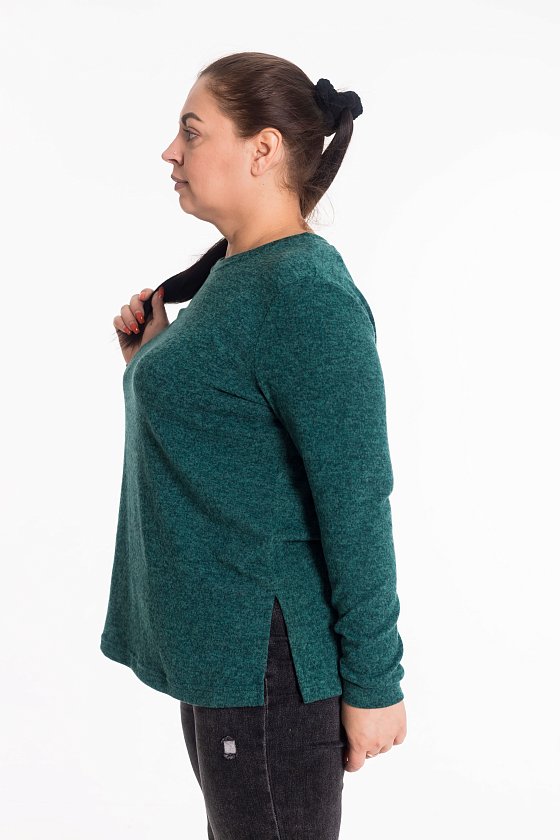 Джемпер полуприлегающего силуэта выполнен из нежной ангоры в цвете изумруд. Модель с втачными рукавами и элегантной планкой  по горловине. Боковые разрезы добавляют образу легкости и динамики. Идеальное сочетание уютного тепла и изысканного стиля.