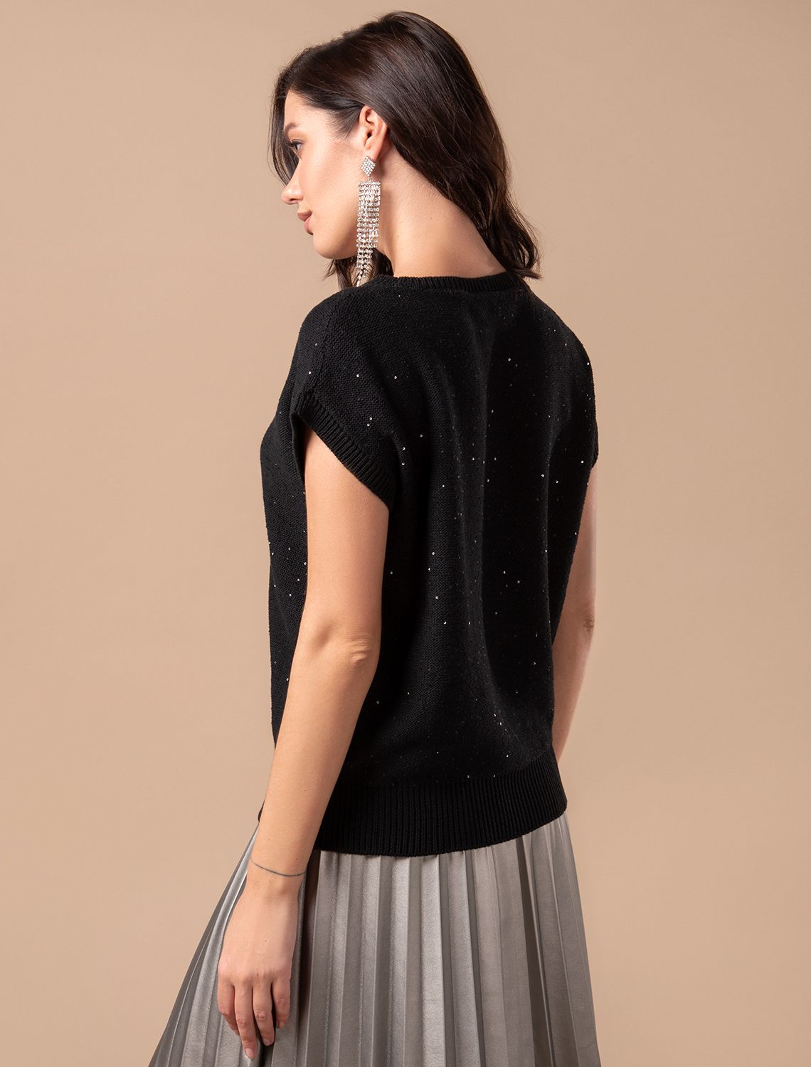 Легкий джемпер черного цвета с цельнокроеным коротким рукавом выполнен из хлопковой пряжи с вкраплением сияющих пайеток, что придает особую изысканность. Стильный джемпер связан изнанкой, пряжа отличается легкостью и приятной текстурой, совершенно не колется, обеспечивает комфорт даже при длительном использовании, а натуральные волокна поддерживают оптимальный температурный баланс. Свободный крой с эластичной манжетой по низу и цельнокроенный рукав создают расслабленный, но аккуратный образ. Нарядный джемпер подойдет девушкам и женщинам больших размеров, в нем вы будете чувствовать себя уверенно и свободно в любой ситуации. Мерцающий эффект пайеток добавляет образу выразительности и индивудуальности. Мерцающее полотно добавляет особого шарма вашему образу, делая его уместным как на праздник, так и для повседневного выхода. Новый год, вечеринка или любое другое мероприятие пройдут ярко — сияющие пайетки создают ощущение праздника в каждом движении. Для спокойного повседневного аутфита добавьте к этому эффектному джемперу спокойный низ, близкий по цвету, без дополнительных элементов декора.