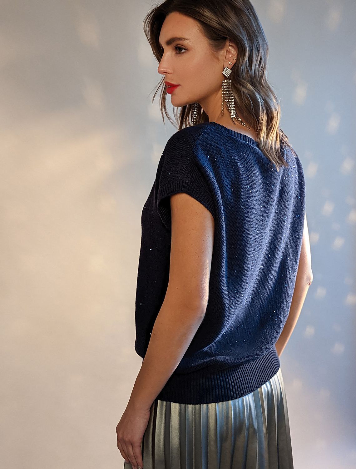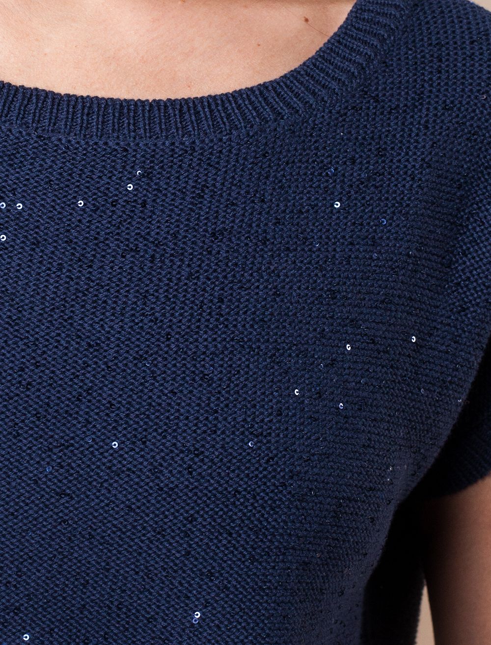 Джемпер с цельнокроенным коротким рукавом из хлопковой пряжи с пайетками. D39.569 синий_пайетки