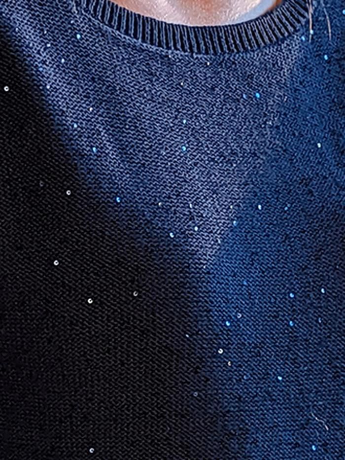 Легкий джемпер благородного синего цвета с цельнокроеным коротким рукавом выполнен из хлопковой пряжи с вкраплением сияющих пайеток, что придает особую изысканность. Стильный джемпер связан изнанкой, пряжа отличается легкостью и приятной текстурой, совершенно не колется, обеспечивает комфорт даже при длительном использовании, а натуральные волокна поддерживают оптимальный температурный баланс. Свободный крой с эластичной манжетой по низу и цельнокроенный рукав создают расслабленный, но аккуратный образ. Нарядный джемпер подойдет девушкам и женщинам больших размеров, в нем вы будете чувствовать себя уверенно и свободно в любой ситуации. Мерцающий эффект пайеток добавляет образу выразительности и индивудуальности. Мерцающее полотно добавляет особого шарма вашему образу, делая его уместным как на праздник, так и для повседневного выхода. Новый год, вечеринка или любое другое мероприятие пройдут ярко — сияющие пайетки создают ощущение праздника в каждом движении. Для спокойного повседневного аутфита добавьте к этому эффектному джемперу спокойный низ, близкий по цвету, без дополнительных элементов декора.