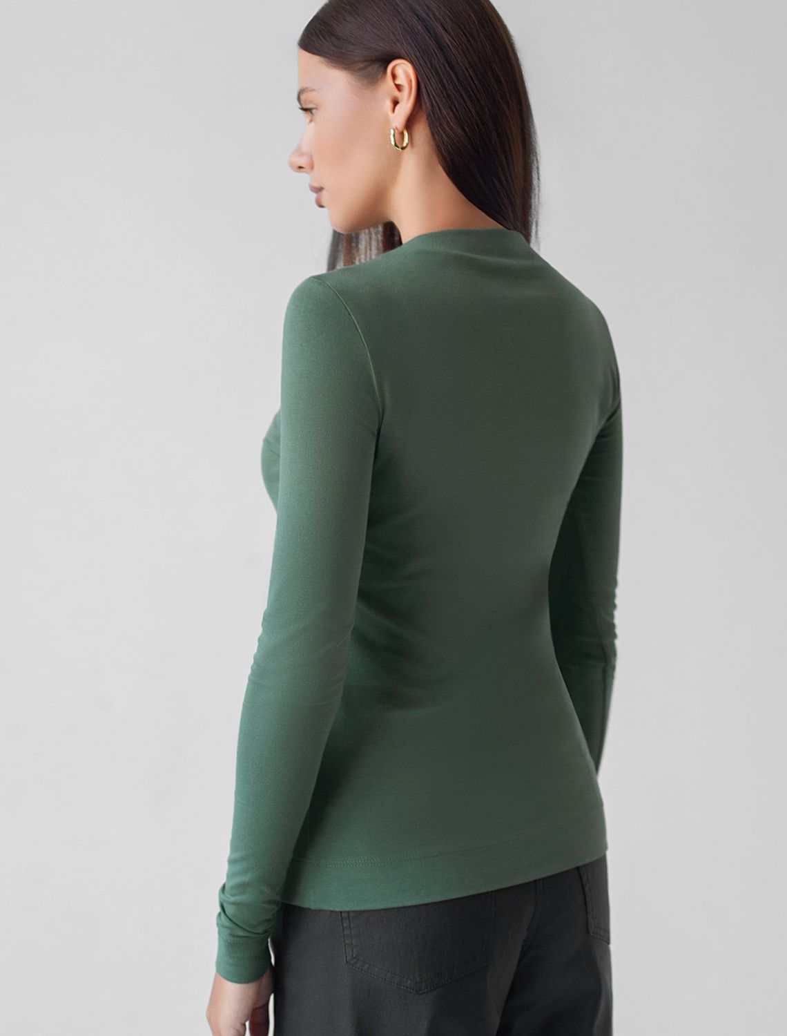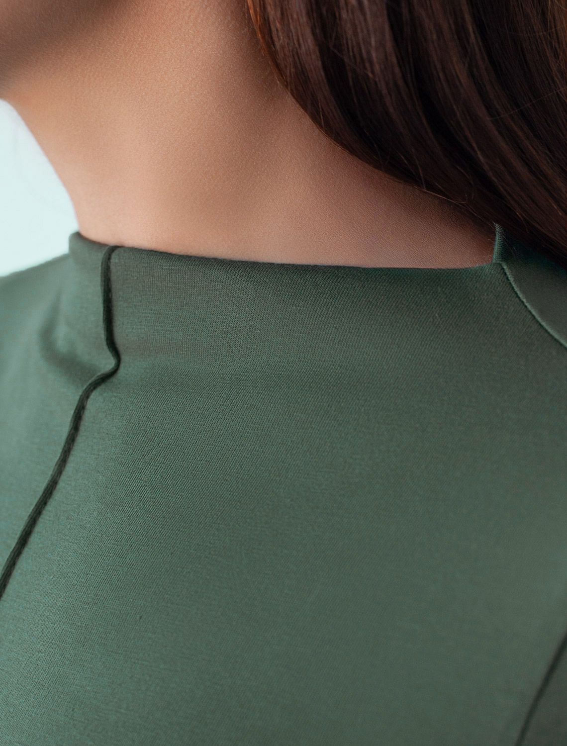 Джемпер прямого силуэта с цельнокроеным воротом выполнен из премиального хлопка. Наличие эластана в составе гарантирует комфорт и формоустойчивостиь изделия. Вертикальный декоративный шов спереди, визуально вытягивает силуэт. Базовая модель хорошо впишется в любой гардероб и подойдет для офисного дресс-кода. К изделию пришит металлический логотип бренда. оливковый