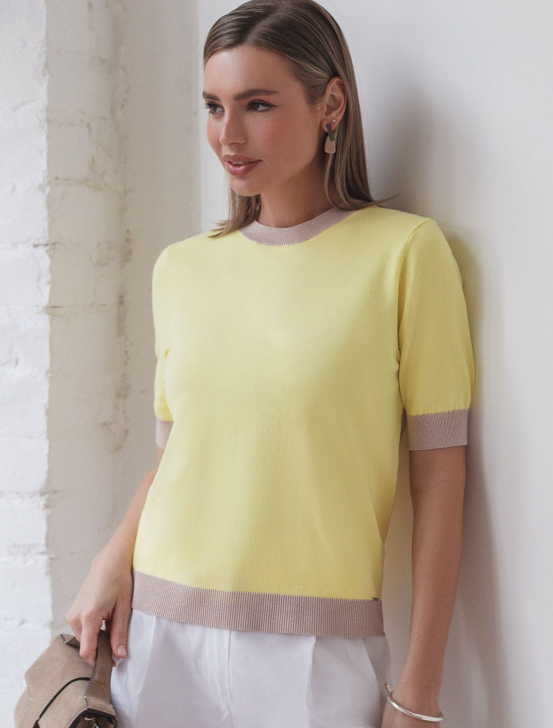 Состав: 80%Вис 20%ПАЛегкий джемпер лимонного цвета с круглым вырезом идеально подходит на весну и лето. Тонкая вязка из вискозы дарит приятный комфорт и ощущение свежести в теплую погоду. Полуприлегающий крой подчеркивает силуэт, а универсальная длина позволяет сочетать джемпер с разными элементами гардероба. Контрастная отделка с мягким люрексом добавляет стильный акцент, создавая выразительный образ. Деликатное мерцание придает праздничное настроение, но не выглядит слишком ярко или вызывающе. Такой элемент украшения позволяет носить нарядный джемпер и на особых мероприятиях. Джемпер отлично смотрится на больших размерах благодаря продуманному крою и полуприлегающему фасону. Этот джемпер с коротким рукавом станет незаменимой частью гардероба в сезоны, когда хочется легкости и элегантности одновременно. Лаконичный дизайн обеспечивает простоту комбинирования с другими вещами и будет универсальной базой для создания разнообразных комплектов — от офисного до непринужденного городского стиля.
