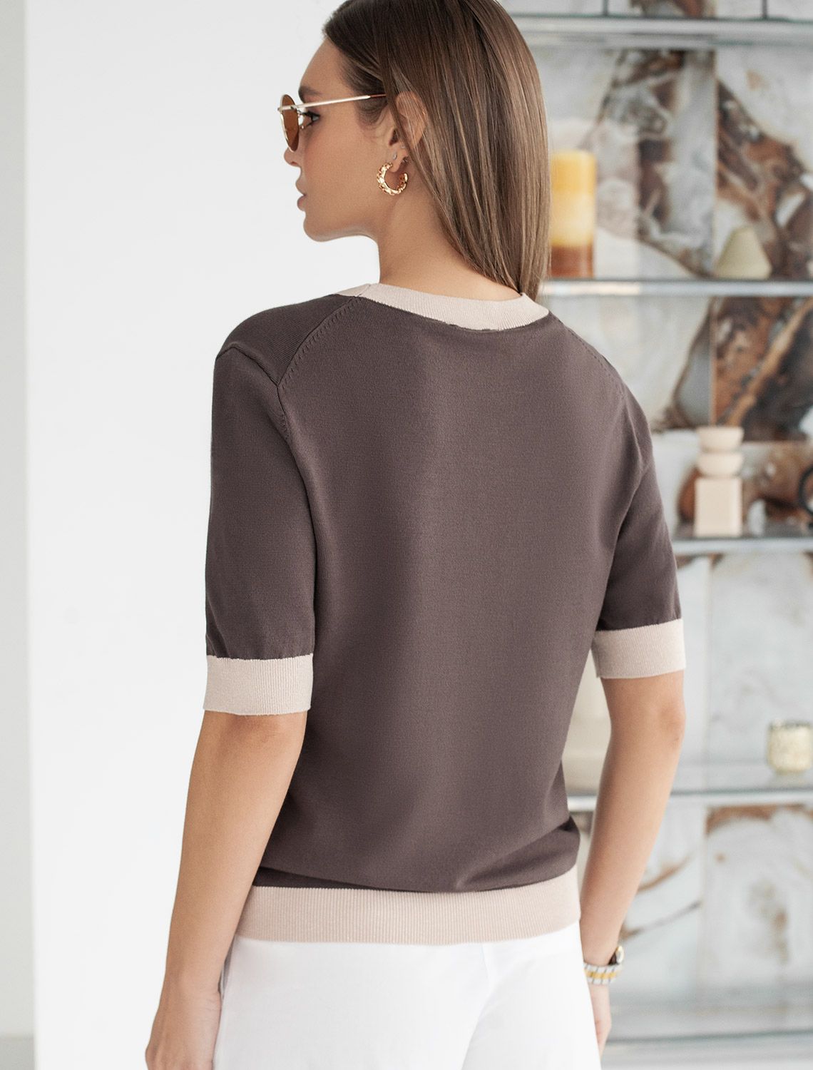 Легкий джемпер кофейного цвета с круглым вырезом идеально подходит на весну и лето. Тонкая вязка из вискозы дарит приятный комфорт и ощущение свежести в теплую погоду. Полуприлегающий крой подчеркивает силуэт, а универсальная длина позволяет сочетать джемпер с разными элементами гардероба. Контрастная отделка с мягким люрексом добавляет стильный акцент, создавая выразительный образ. Деликатное мерцание придает праздничное настроение, но не выглядит слишком ярко или вызывающе. Такой элемент украшения позволяет носить нарядный джемпер и на особых мероприятиях. Джемпер отлично смотрится на больших размерах благодаря продуманному крою и полуприлегающему фасону. Этот джемпер с коротким рукавом станет незаменимой частью гардероба в сезоны, когда хочется легкости и элегантности одновременно. Лаконичный дизайн обеспечивает простоту комбинирования с другими вещами и будет универсальной базой для создания разнообразных комплектов — от офисного до непринужденного городского стиля.