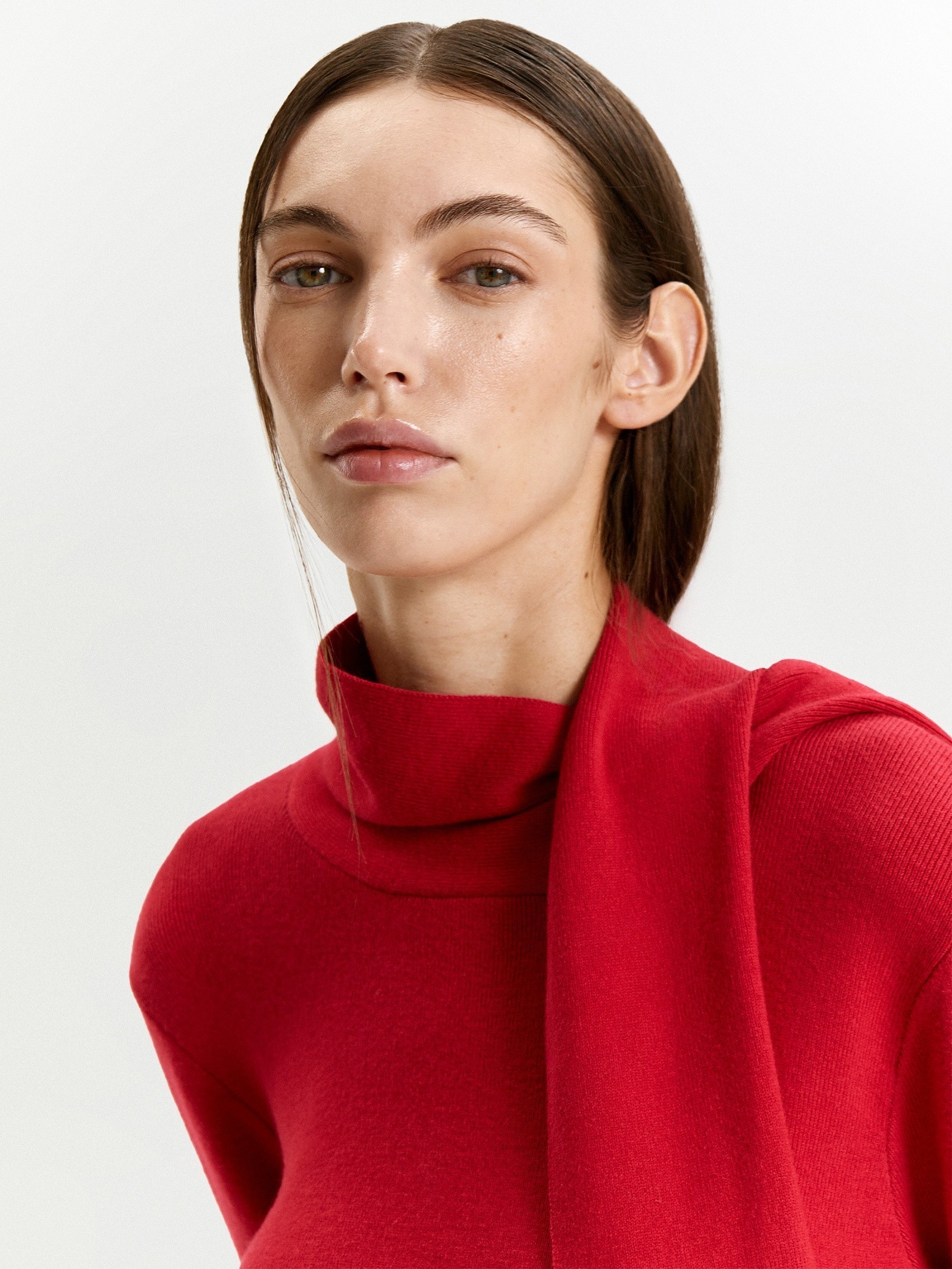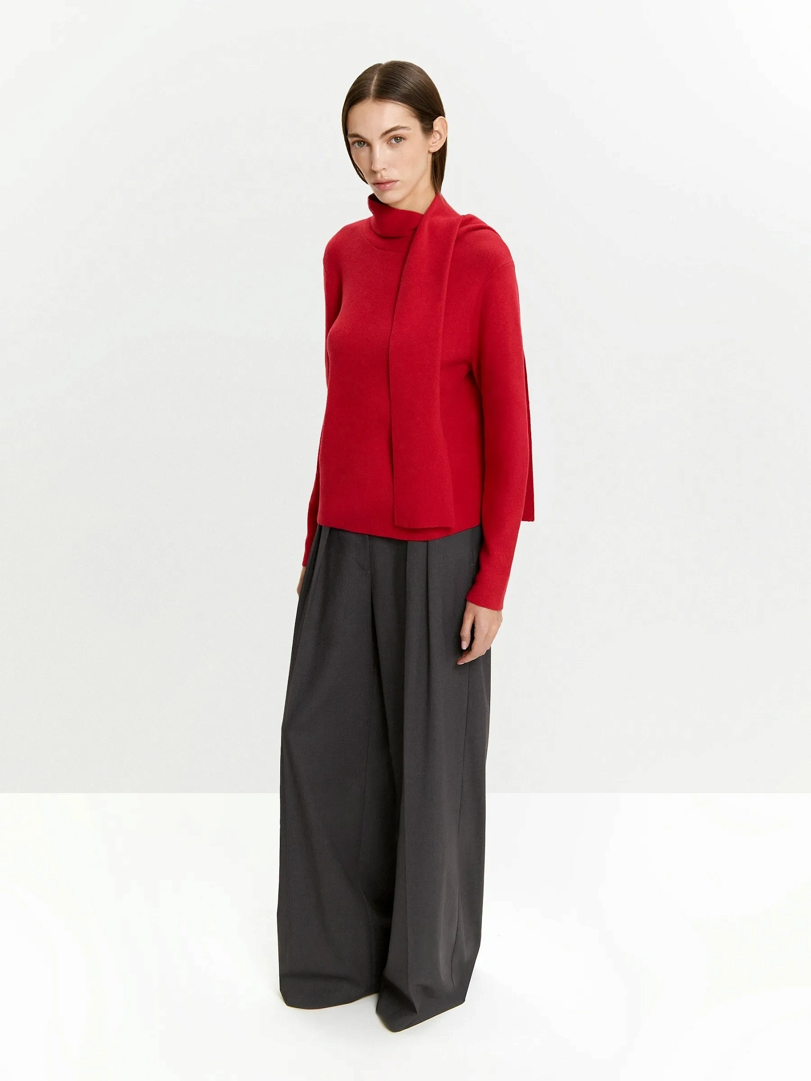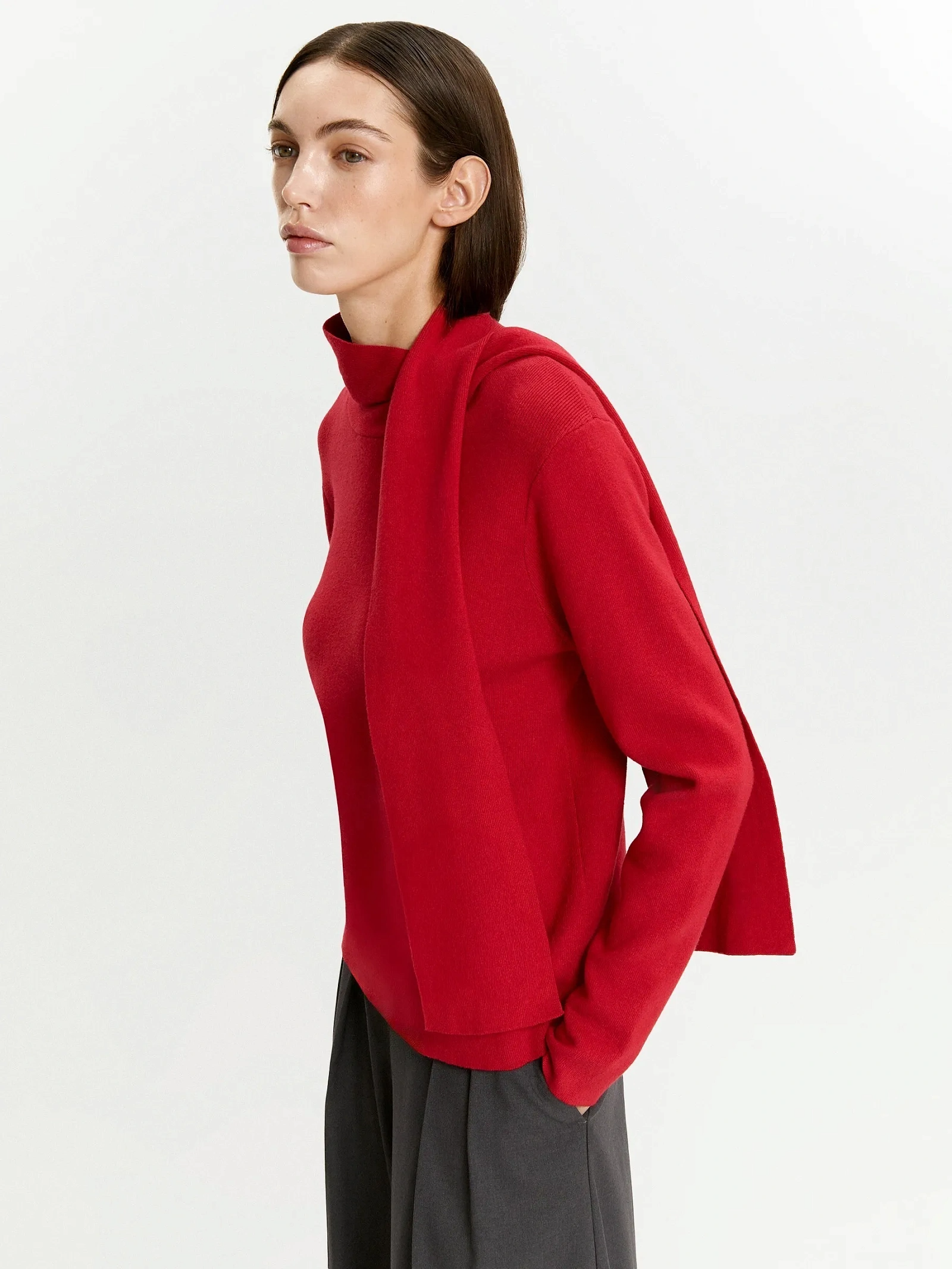 Элегантность образу добавит оригинальная горловина с отлётными деталями. Их можно стилизовать как шарф, как бант, завязывать и набрасывать разными способами по настроению. В демисезон это особенно актуально: на улице и в помещении можно легко и стильно защитить горло от ветра.