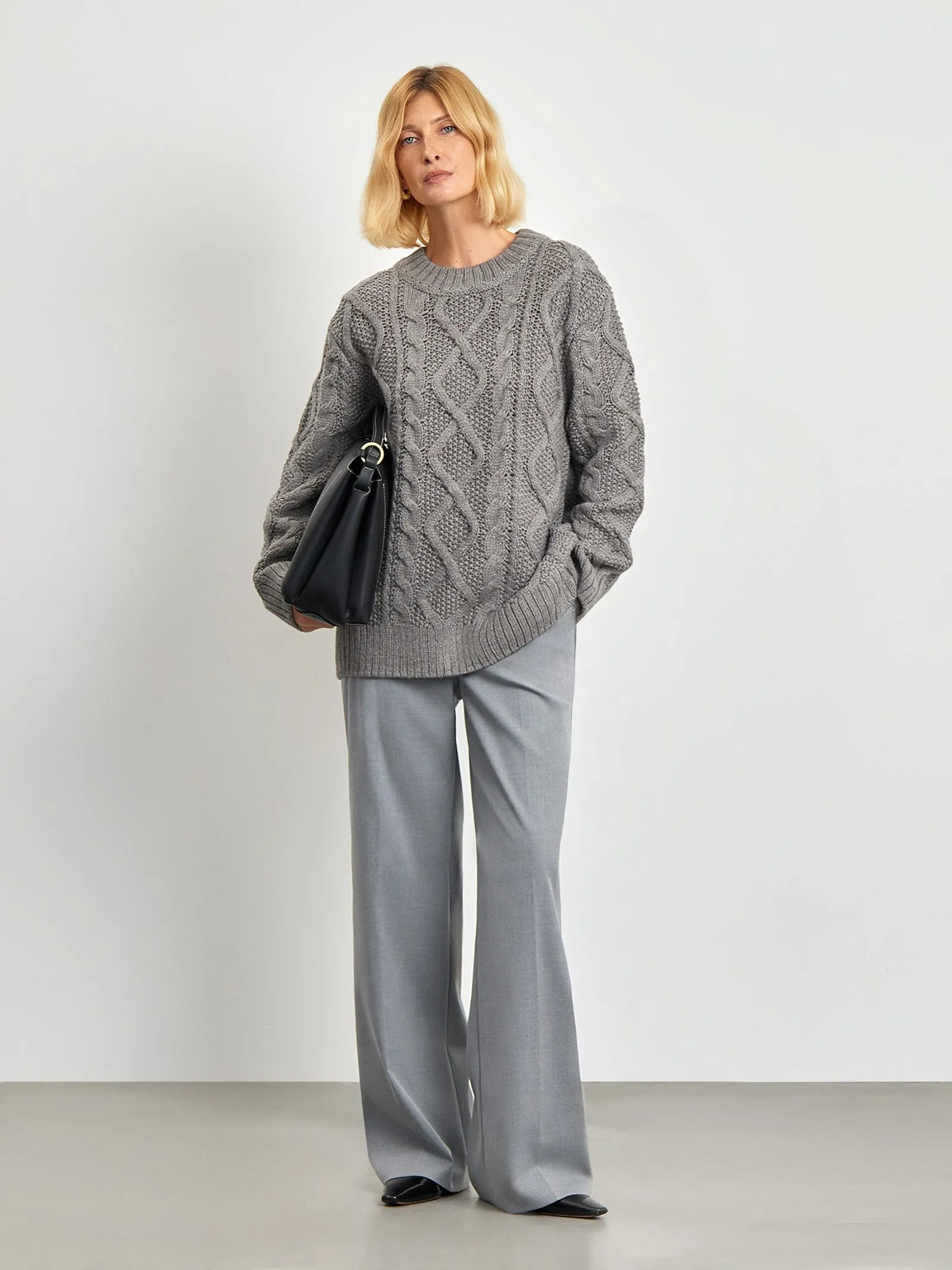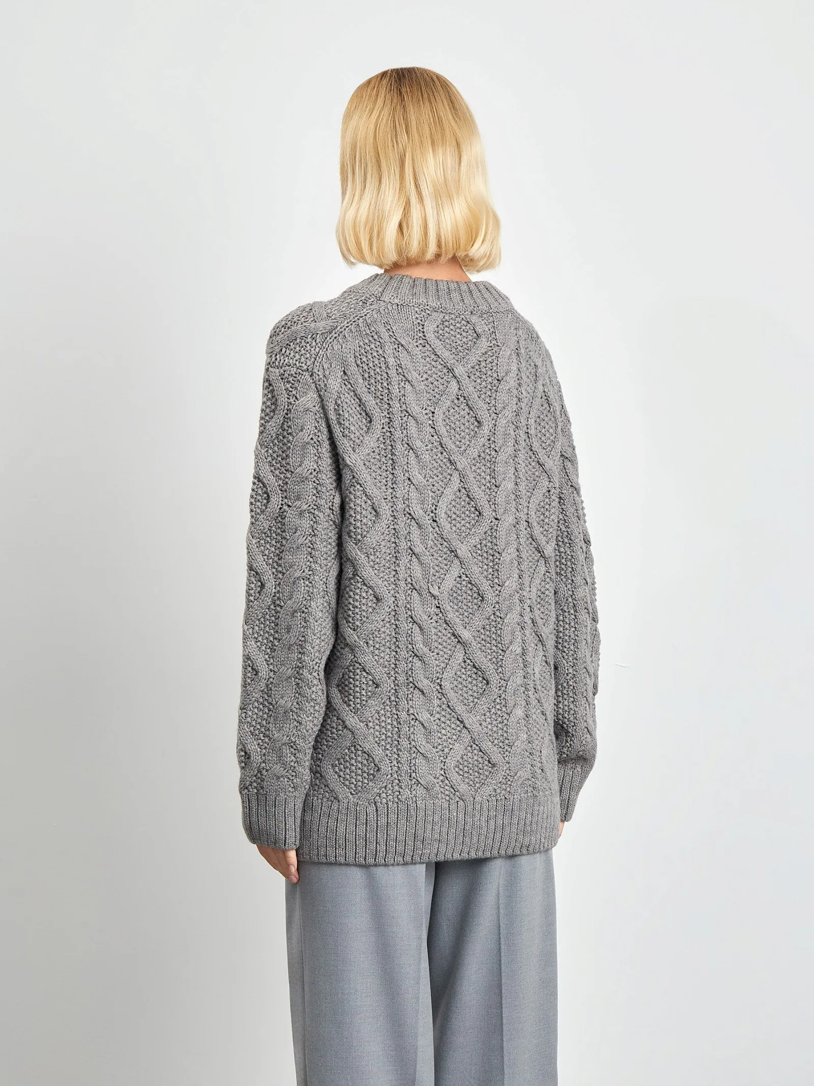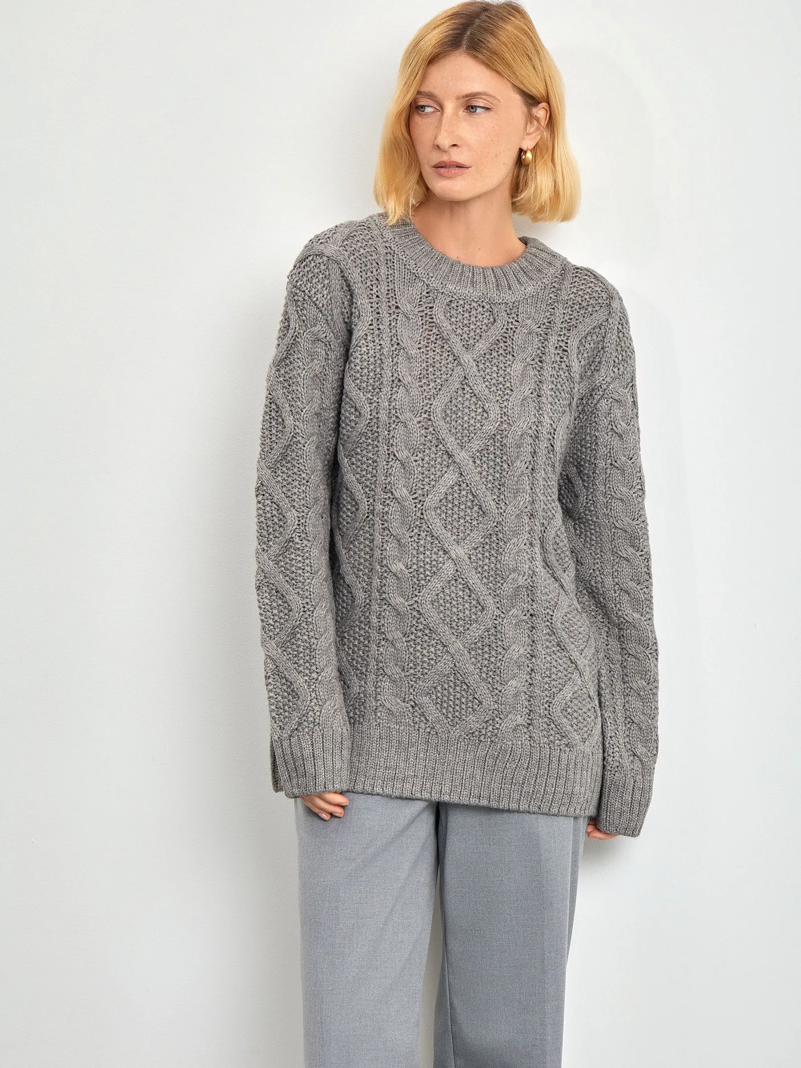 Актуальный свитер крупной вязки с косами. Выполнен в сером цвете из материала с содержанием натуральной шерсти. Модель с круглой горловиной и спущенным плечом имеет удлинённые рукава.