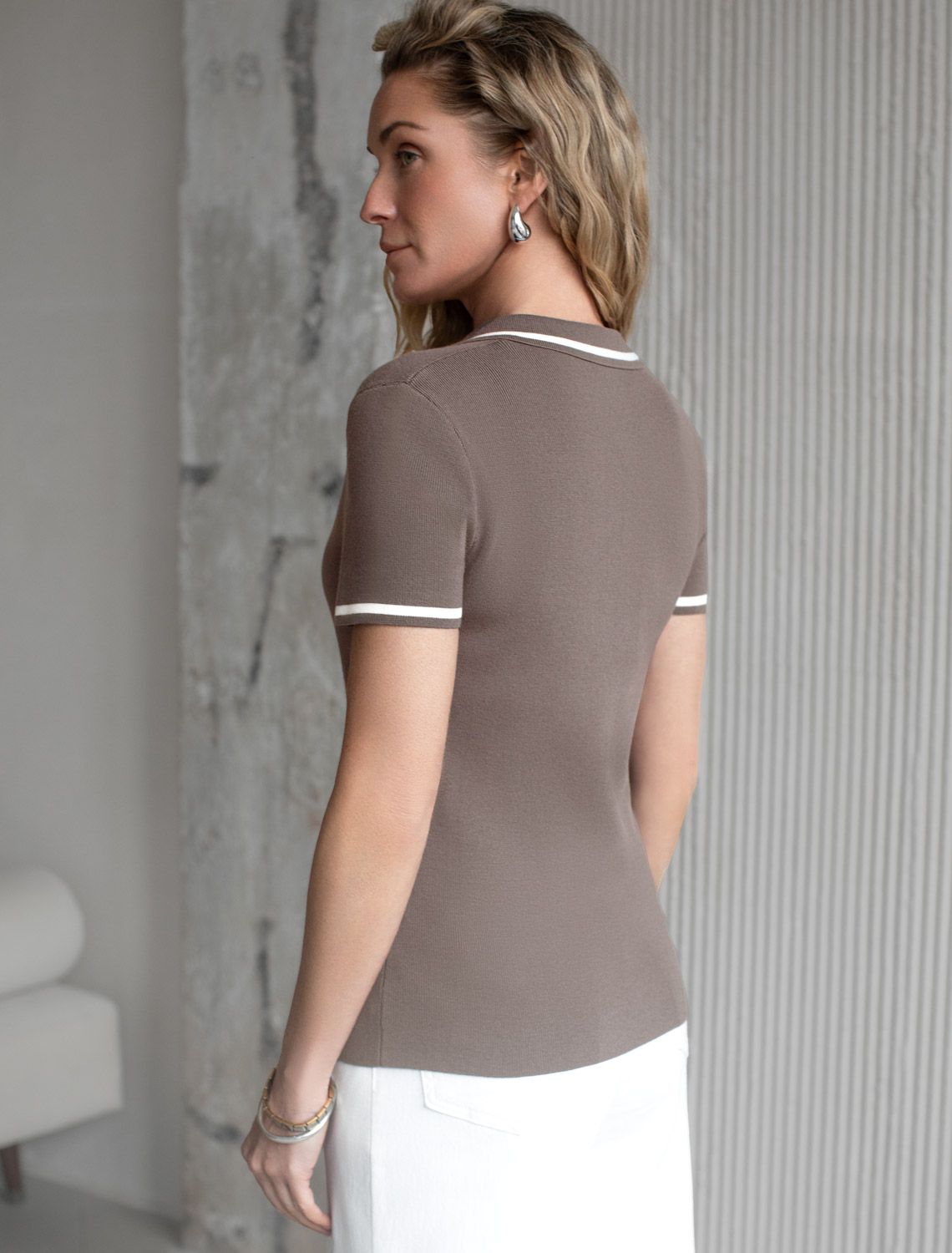 Джемпер с воротником-поло с коротким рукавом тонкой вязки из вискозы D39.389 кофейный