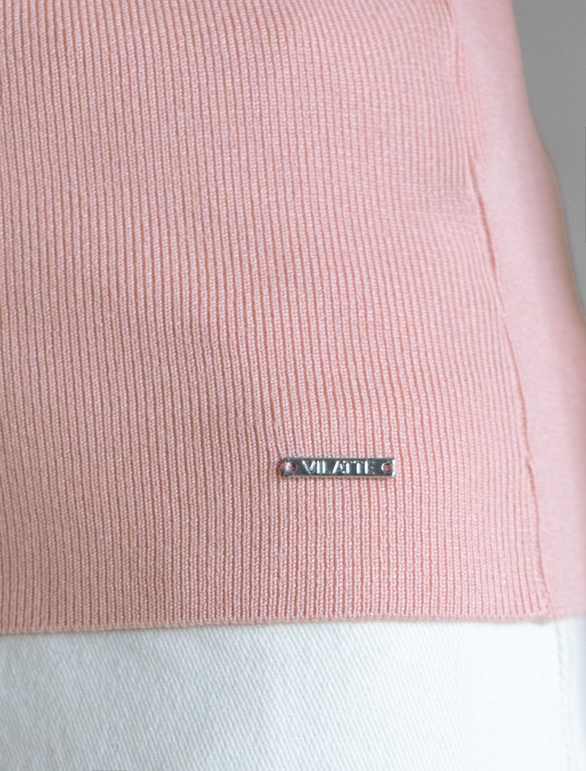 Легкий джемпер светло-розового цвета с V-вырезом и отложным воротником идеально подходит на весну и лето. Для производства изделия использована пряжа сердечникового прядения — когда нейлоновая нить (основа) обвивается вискозой. Вискоза обеспечивает приятную тактильность и гигроскопичность, а нейлон предотвращает растяжение и повышает устойчивость к пилингуемости. Вязка в тонкий рубчик дарит приятный комфорт и ощущение свежести в теплую погоду. Полуприлегающий крой подчеркивает силуэт, а универсальная длина позволяет сочетать джемпер с разными элементами гардероба. Контрастная отделка в виде тонких полосок добавляет стильный акцент, создавая выразительный образ. V-вырез подчеркивает зону декольте и визуально вытягивает шею, делая фигуру более изящной, а классический отложной воротник делает внешний вид более аккуратным и завершенным. Джемпер отлично смотрится на больших размерах благодаря продуманному крою и полуприлегающему фасону. Этот джемпер с коротким рукавом станет незаменимой частью гардероба в сезоны, когда хочется легкости и элегантности одновременно. Лаконичный дизайн обеспечивает простоту комбинирования с другими вещами и будет универсальной базой для создания разнообразных комплектов — от офисного до непринужденного городского стиля.