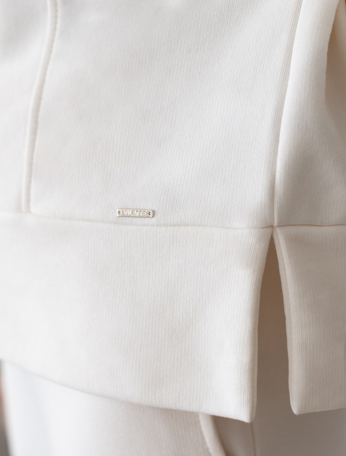 Уютный и комфортный вариант для прохладной погоды – стильный джемпер белого цвета с воротом на молнии. Изготовлен из премиального футера трехнитки с добавлением эластана. Материал сохраняет форму при длительном ношении и после многократных стирок, его мягкая текстура дарит ощущение уюта и тепла.