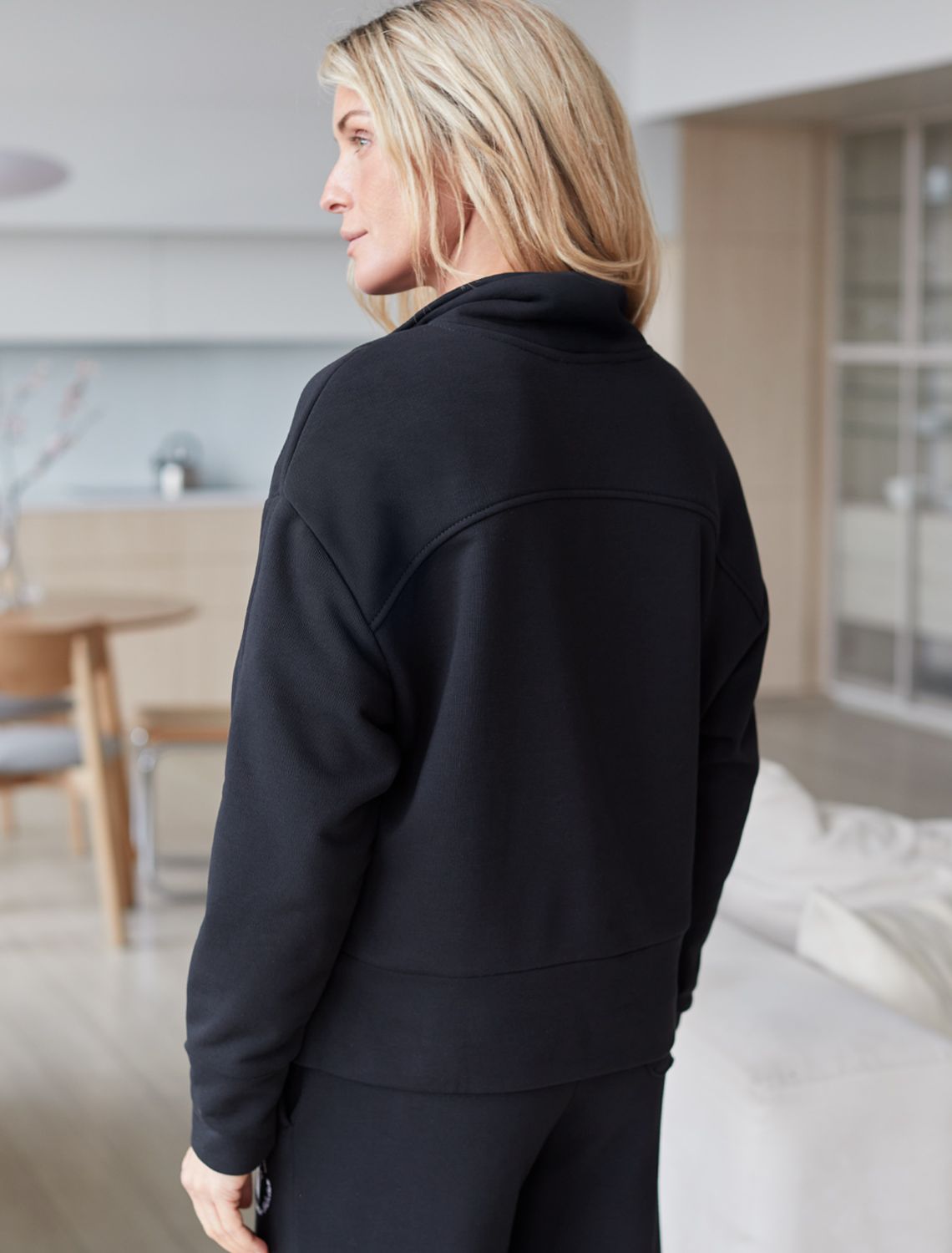 Уютный и комфортный вариант для прохладной погоды – стильный джемпер с воротом на молнии практичного черного цвета. Изготовлен из премиального футера трехнитки с добавлением эластана. Материал сохраняет форму при длительном ношении и после многократных стирок, его мягкая текстура дарит ощущение уюта и тепла.