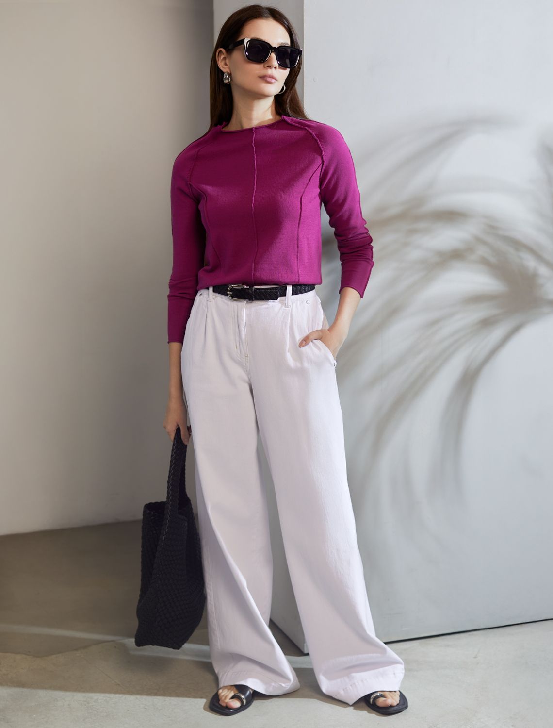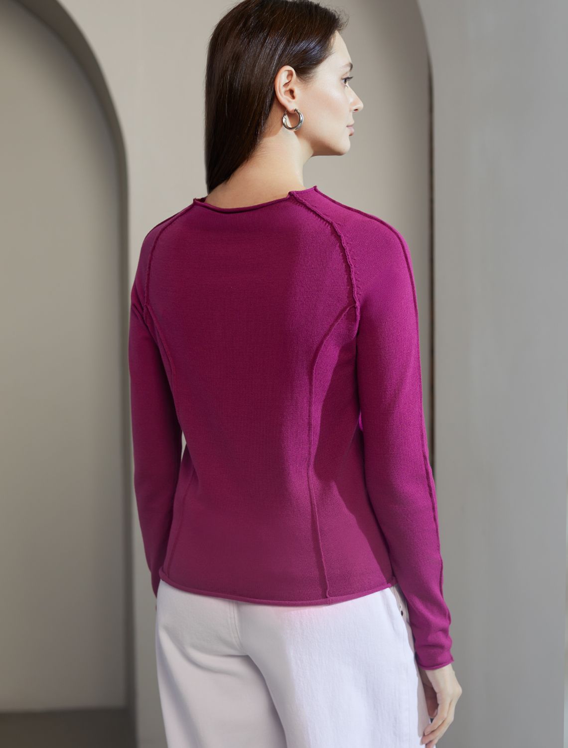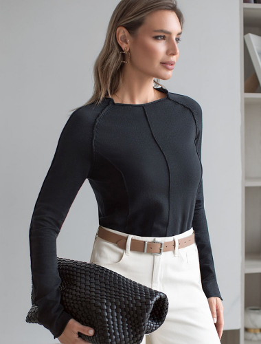 Джемпер тонкой вязки выполнен из мягкой хлопковой пряжи. Модель с декоративными швами идеально сидит по фигуре подчеркиваяч изгибы тела. Подходит для любой фигуры и впишется в любой гардероб. Изделие дополнено металлическим логотипом бренда.