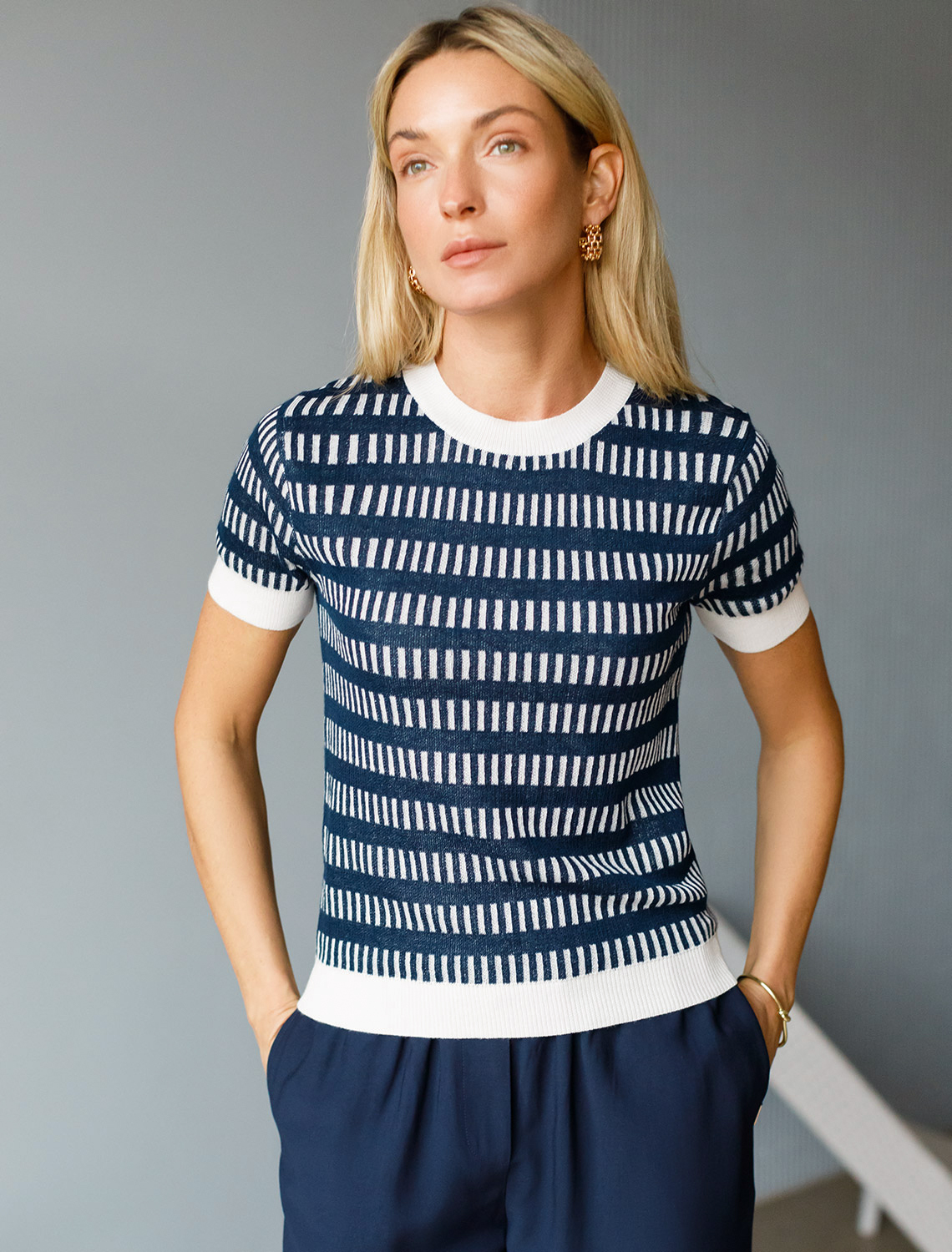 Топ тонкой вязки выполнен из полиэстера с добавлением вискозы. Вертикальный вывязанный принт визуально стройнит и вытягивает силуэт. Добавление в состав ПЭ способствует легкости и износостойкости изделия. Мягкая пряжа приятно ощущается на теле и дарит настоящий комфорт в теплое время года. Хорошо сочетается с белыми и синими низами поддерживая морской стиль 65%ПЭ 35%Вис