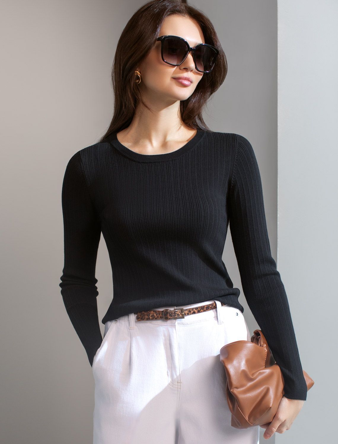 Джемпер тонкой вязки выполнен из вискозы с нейлоном. Для производства изделия использована пряжа сердечникового прядения — когда нейлоновая нить (основа) обвивается вискозой. Вискоза обеспечивает приятную тактильность и гигроскопичность, а нейлон предотвращает растяжение и повышает устойчивость к пилингуемости. Модель прилегающего кроя безупречно сидит по фигуре не сковывая движений. Изделие дополнено фирменным металлическим логотипом бренда. черный