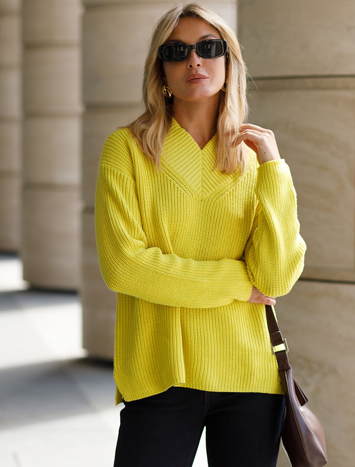 Рост 172, бюст 88, талия 64, бедра 88 Джемпер выполнен из мягкой хлопковой пряжи с добавлением акрила. Трендовый воротник с высоким V-вырезом и крупная вязка сделали изделие универсальным решением при выборе, между свитером и джемпером в холодное время года. Изделие дополнено металлическим логотипом бренда.