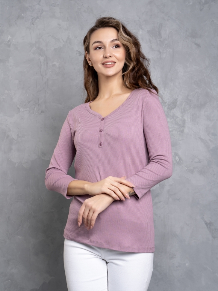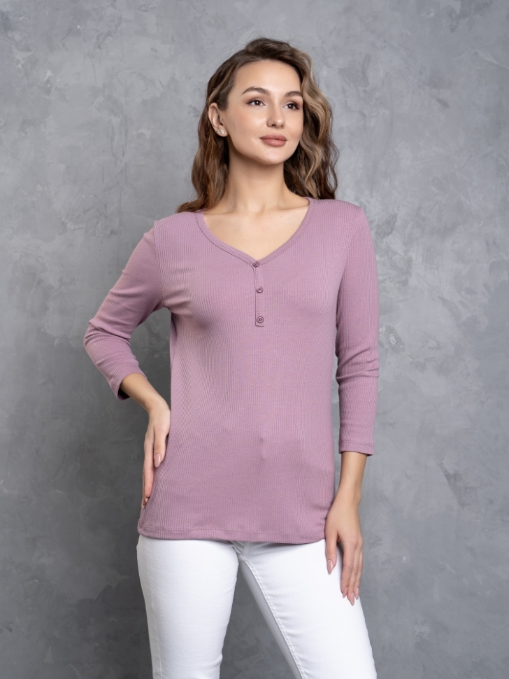Женский трикотажный джемпер прилегающего силуэта длиной до середины бедра. Рукава базового кроя длиной ¾. Глубокий треугольный вырез горловины, окантованный обтачкой, переходит в «имитацию застежки», которая декорирована пуговицами.Джемпер из трикотажа, похожего на «английскую резинку» - тренд сезона (своеобразный штрих из моды 80-х, знаменитая «лапша»). Джемпер хорошо прилегает к телу и подчеркивает все изгибы фигуры, а V- образный вырез вытягивает шею и привлекает внимание к области декольте. Модель подходит для активных женщин, которые хотят выглядеть красиво и стильно, но при этом чувствовать себя максимально комфортно. Рост модели на фото 170 см. Параметры модели: 80-61-87. Размер изделия на модели: 46. Размер – Длина изделия по полочке (см): 46 – 62 48 – 62,5 50 – 63 52 – 63,5 54 – 64,5 56 – 65 58 – 65,5 60 – 66 Материал: кашкорсе с лайкрой (вискоза 95%, лайкра 5%)
