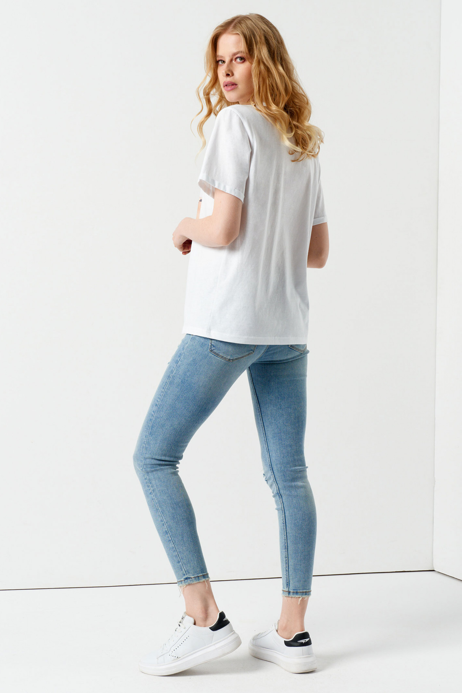Летний джемпер с коротким рукавом подарит вам комфорт и свободу движений. Его можно сочетать с джинсами, брюками, шортами, джинсовыми юбками, составлять модные образы для прогулок, вечеринок с друзьями и отдыха. Женская футболка украшена принтом, что придает однотонному изделию ноту пикантности. Натуральный хлопок, из которого изготовлен легкий джемпер, дарит приятные ощущения – не парит и не холодит. Даже в жаркую погоды, летняя женская футболка подарит вам исключительный комфорт.