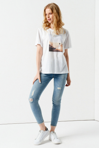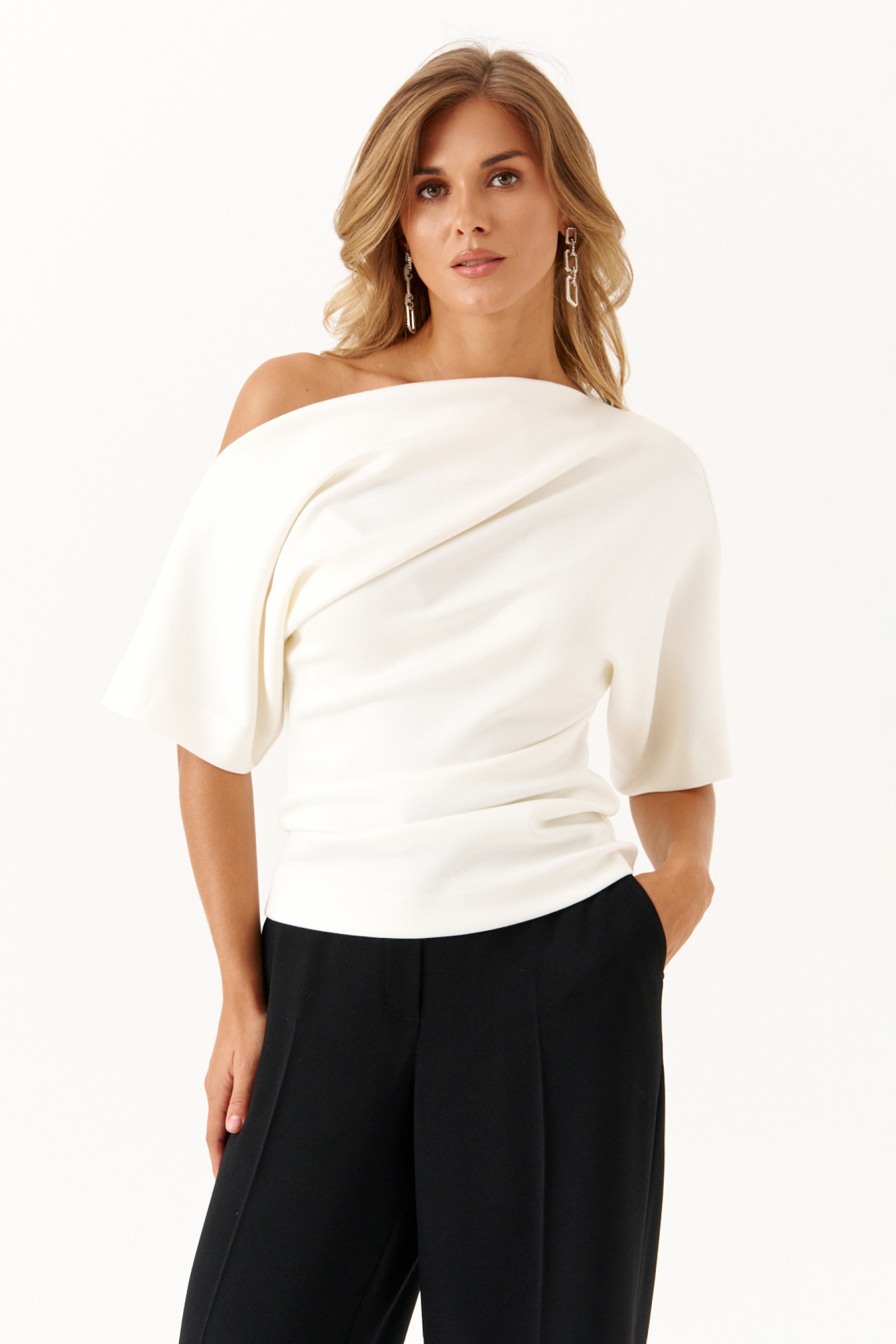 Женский джемпер молочного цвета из мягкого трикотажа. Стильный джемпер асимметричного фасона выполнен из мягкого и комфортного трикотажного полотна. Модель длиной на уровне бедер отлично подходит для повседневной носки. Цельнокроеные рукава длиной до локтя и расширенная горловина придают изделию современный и легкий образ. Джемпер станет универсальным дополнением вашего гардероба, сочетая комфорт и оригинальный дизайн.
