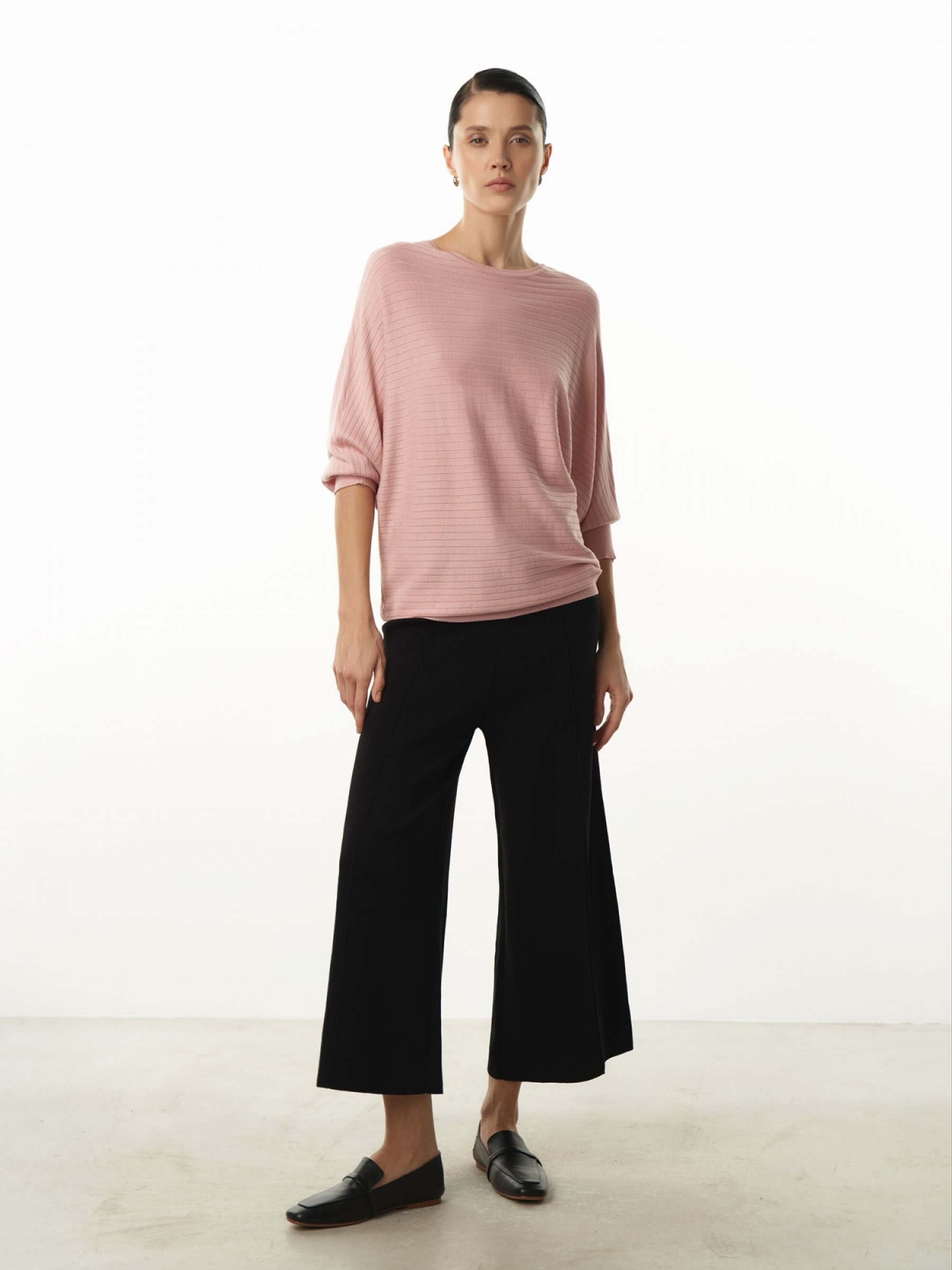 Базовый джемпер свободного кроя поможет создать множество красивых образов на каждый день. Украшен горизонтальной ажурной вязкой, придающей изделию утонченность. . Изделие имеет комфортный объемный крой, рукава “летучая мышь”, свободную линию плеча и прилегающие манжеты, декорированные резинкой. По низу изделия – широкая резинка в тон. Модель выполнена в универсальных цветах: розовом, бежевом и голубом.