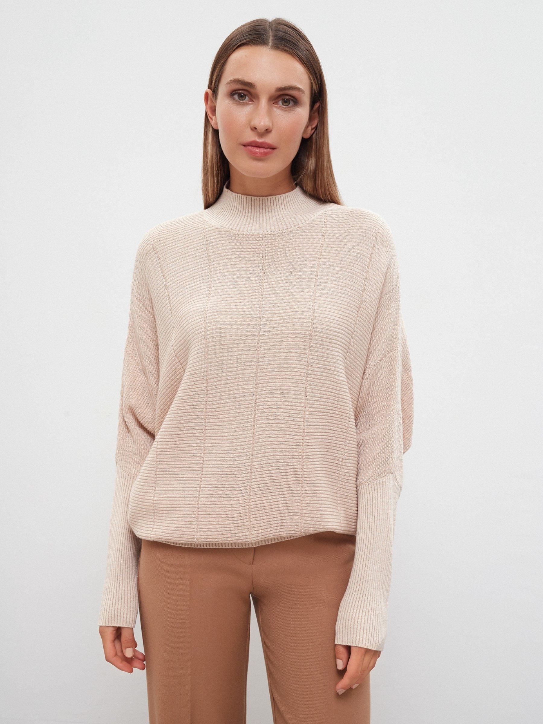 Сдержанный джемпер свободного кроя со спущенной линией плеч. Выполнен из мягкой пряжи из вискозы, шерсти и нейлона фактурной вязки с деликатными вкраплениями люрекса, придающего благородный блеск. Модель дополнена рельефным воротником-стойкой и широкими манжетами на рукавах и поясе. Добавьте к вашему наряду свободные строгие брюки. Для стильной многослойности можно накинуть на плечи жакет