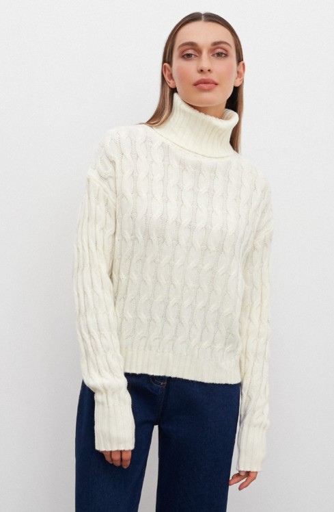 Базовый уютный джемпер фактурной вязки. Для модели выбрали пряжу из мерсеризованной шерсти и нейлона. Джемпер с высоким воротником — комфортная альтернатива водолазкам и свитерам в многослойных образах. Плотный трикотаж с акцентами в виде узорной вязки, спущенных рукавов и высокого ворота добавляет образу стильный объем. 55% акрил 25% нейлон 20% мерсеризованная шерсть