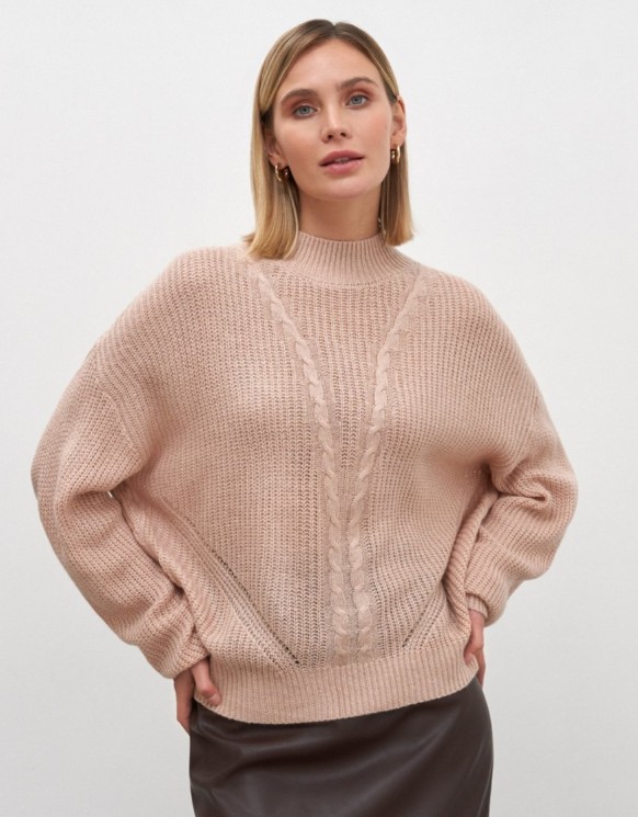 Воздушный свитер фактурной вязки. Выполнен из мягкой теплой пряжи из 100% акрила. Комфортный в носке, мягкий и нежный материал отлично сохраняет тепло, обладает высокой износостойкостью и хорошо держит форму. Свободный летящий силуэт, широкие рукава-воланы и высокий воротник. Манжеты рукавов, низ изделия и ворот обрамлены широкими манжетами. Лицевая часть свитера украшена рельефной вязкой в виде кос и ажурными вставками. Рекомендуем носить свитер в дуэте с джинсовой юбкой ниже колена или джинсами с высокой посадкой. 100% акрил