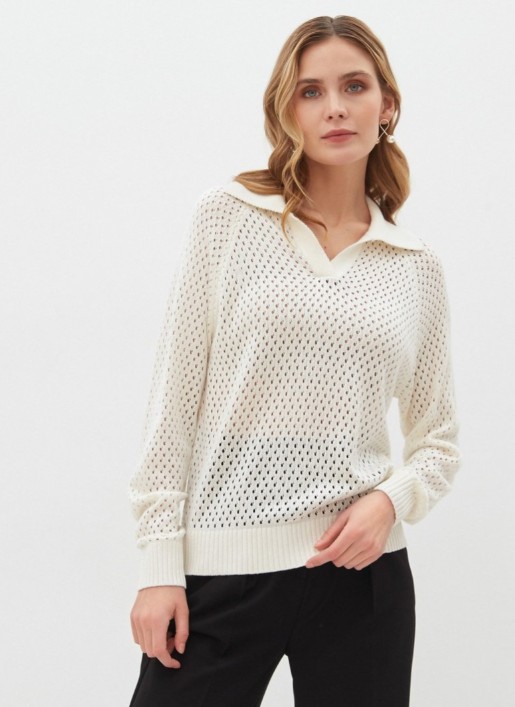 Стильный джемпер ажурной вязки с воротником-поло. Джемпер из тонкой смешанной пряжи отлично подходит к одежде как в спортивном, так и в классическом стилях. 97% вискоза, 3% нейлон