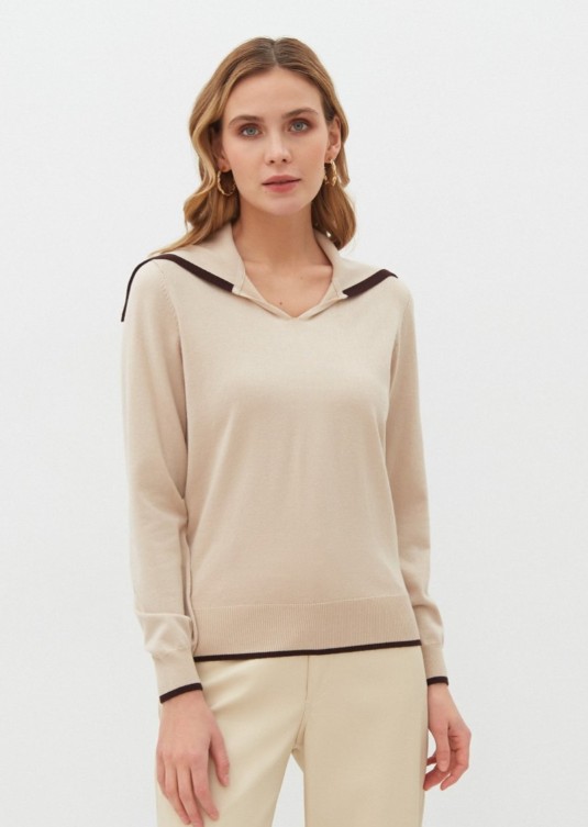 Джемпер с отложным воротникм – оригинальная и стильная вещь. Модель средней длины прямого силуэта будет уместна в каждом гардеробе. Воротничок, удлиненные манжеты и низ оформлены контрастными полосками. Джемпер изготовлен из мягкого трикотажа. 80% вискоза, 20% нейлон