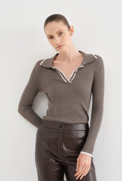 Идея этого облегающего трикотажного джемпера – стать вашей второй кожей и подчеркнуть фигуру. Для этого мы выполнили его фактурной вязкой кашкорсе. Воротник поло оформлен акцентной отделкой и за счет пуговиц позволяет регулировать глубину декольте. Материал – дышащее эластичное полотно на основе вискозы, идеальное на каждый день. Модель можно вписать в разные образы – от деловых до более расслабленных. 80% вискоза, 20% нейлон