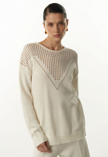 Этот элегантный джемпер фактурной комбинированной вязки выделяет красивое сочитание глаткого и ажурного трикотажного полотна. Тонкая ажурная вязка дает акцент на плечи и линию декольте. Удлиненная модель свободного кроя со спущенной линией плеч и зауженными рукавами полной длины. Круглая горловина оформлена обтачкой, манжеты и низ – фактурной резинкой. Джемпер изготовлен из ультрамягкого трикотажа, приятен телу и прост в уходе. Монохромные универсальные цвета: серо-бежевый, джинсовый, молочный.