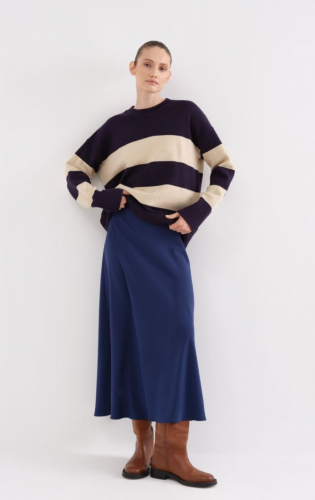 Акцентный джемпер в классическом исполнении – прямого свободного кроя и с аккуратной круглой горловиной. Отличный компаньон для деловых и casual-луков. Оформлен трендовыми широкими полосами, которые чередуются на основной части и рукавах, что придает дизайну динамику. Принт начинается от зоны груди, визуально облегчая верх. Еще отметим мягкий теплый трикотаж на основе вискозы, который подарит уют и респектабельный вид.