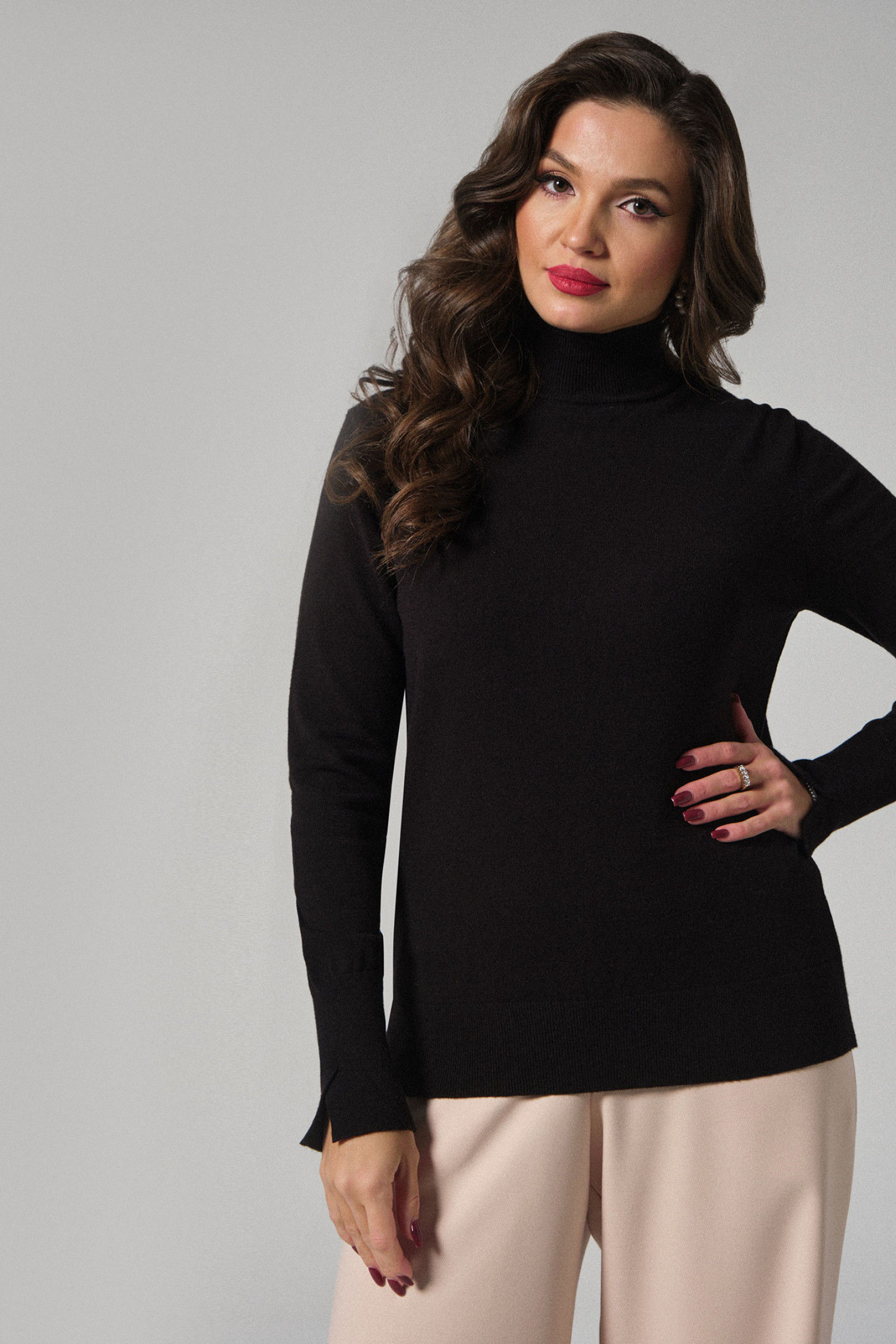 Джемпер женский из вискозной пряжи пряжи машинной вязки для повседневной носки. Джемпер прямого силуэта. Горловина обработана стойкой. Рукава чуть объемные с удлиненной манжетой, по манжете небольшой разрез. Низ джемпера с довязом на резинке. Очень эстетичный и очарователный джемпер, который отлично подчеркнет вашу фигуру. Джемпер удобный в носке и очень комфортный к телу.