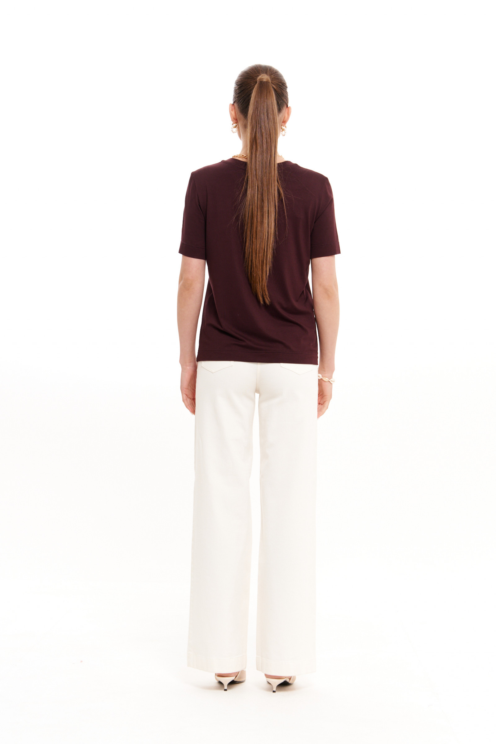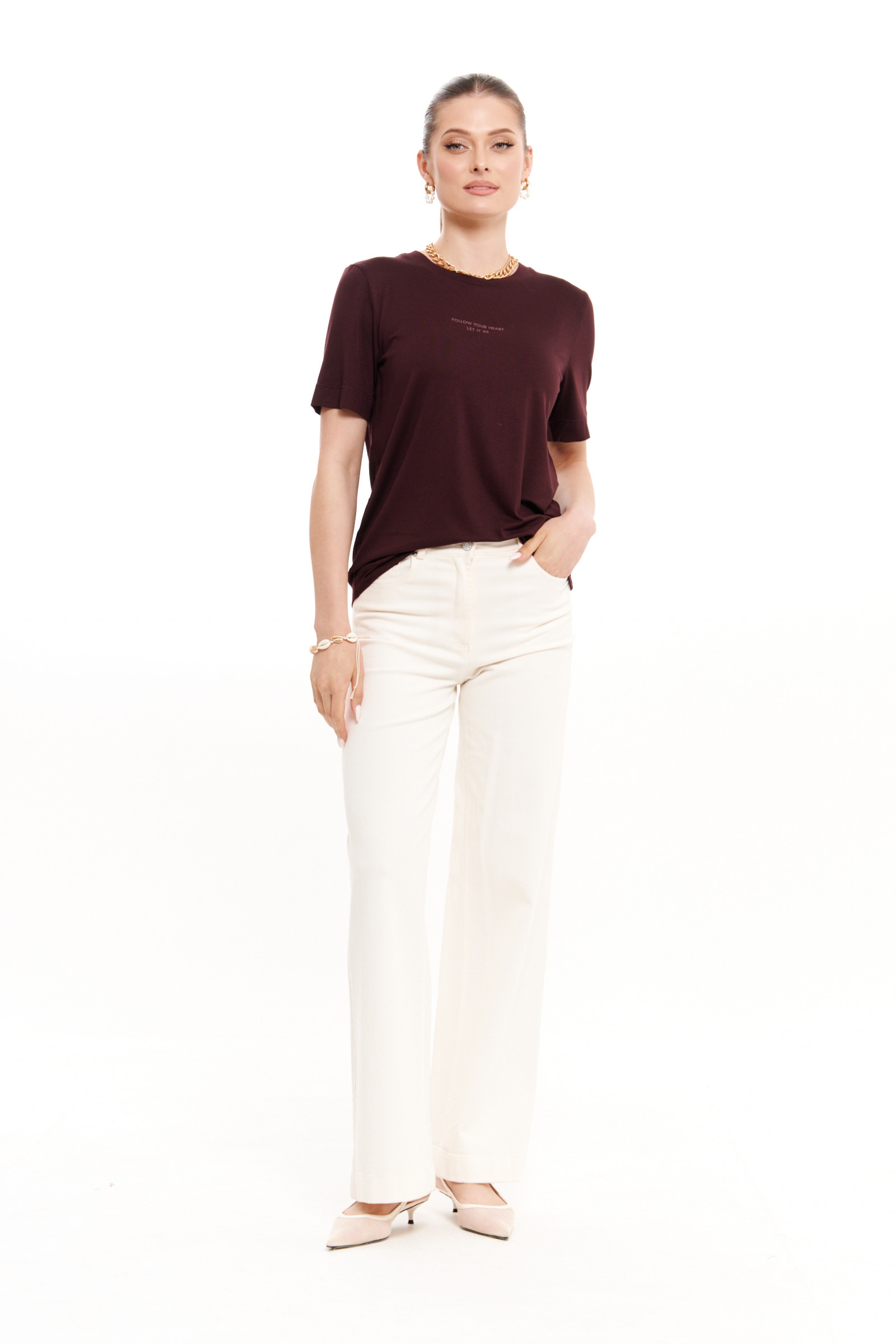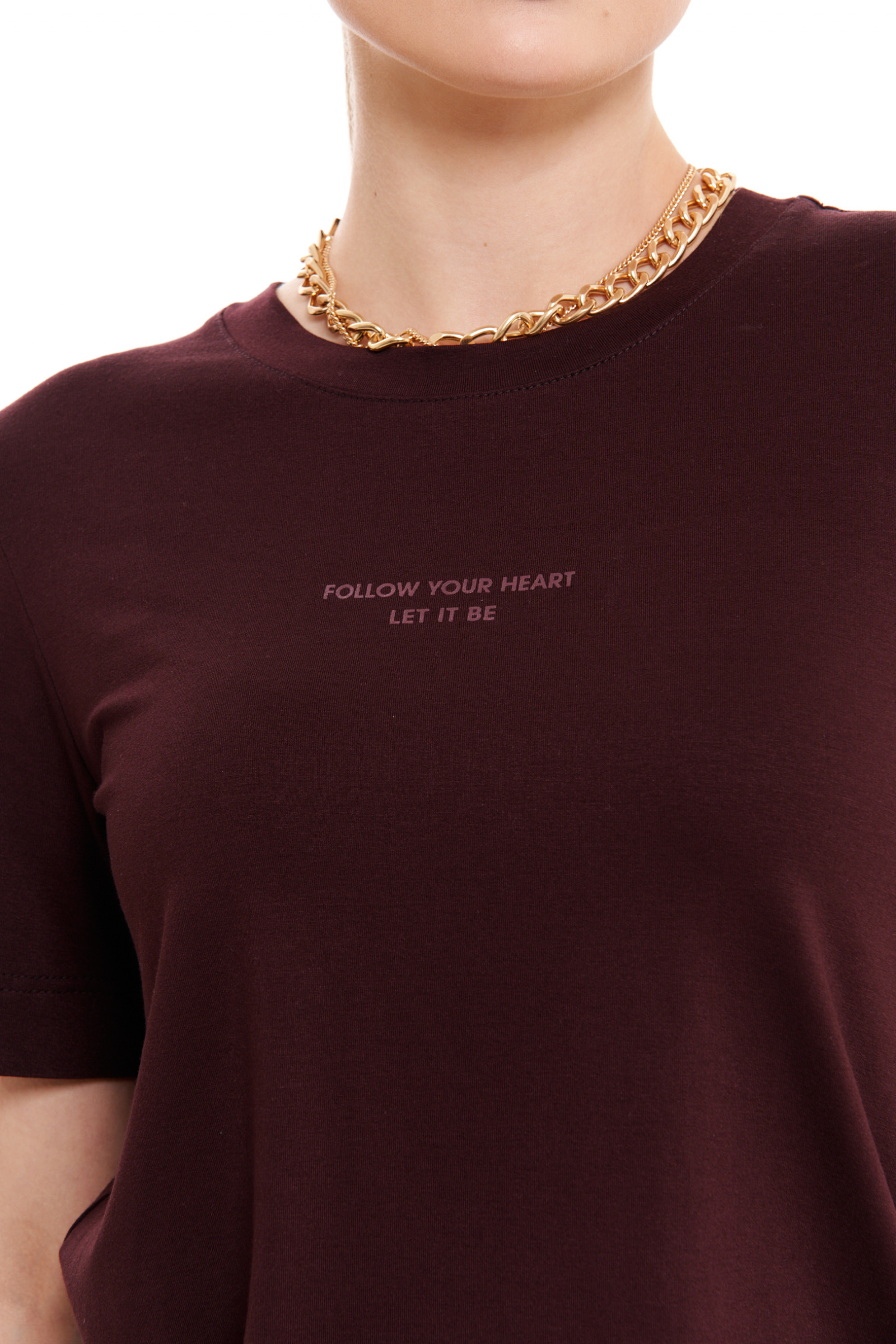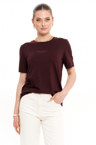 Джемпер женский из вискозного трикотажа для повседневной носки. Джемпер прямого силуэта. Перед имеет дизайнерскую печать в виде надписи. Горловина чуть расширена, обработана притачной тесьмой. Рукава втачные, длинной чуть ниже локтя. Стильный джемпер в коричневом оттенке, который отлично подойдет под любой ваш образ и будет радовать ваш глаз. Данный джемпер отлично будет сидеть на любой фигуре и подчеркивать все ваше изящество.