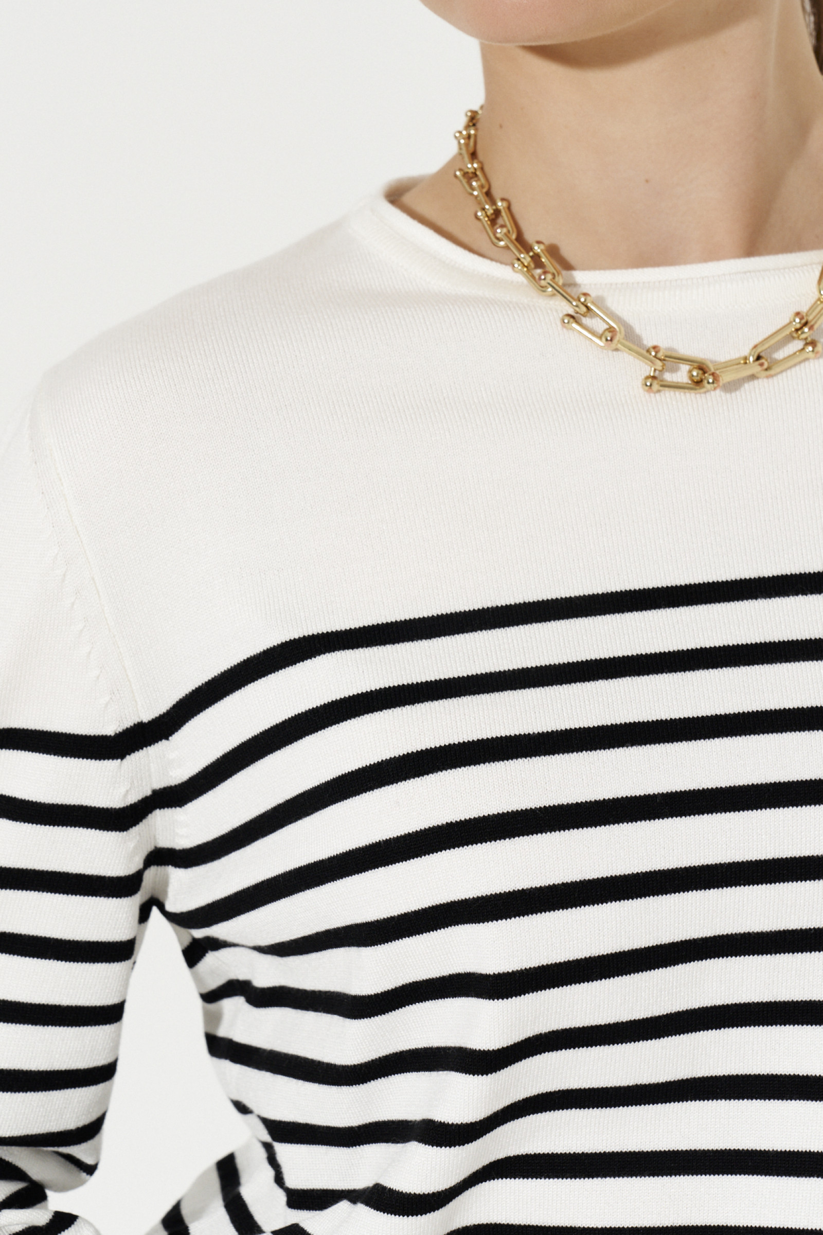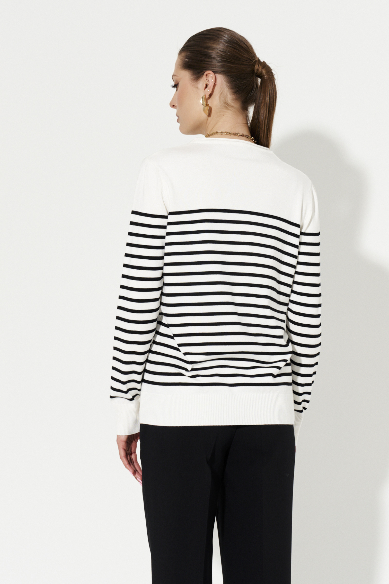Джемпер женский из вискозной пряжи машинной вязки для повседневной носки. Джемпер прямого силуэта. По низу изделия и по низу рукава имеется довяз на резинке. Джемпер в двух монохромных цветах: черный в белую полоску и белый в чёрную полоску. Стильный и универсальный джемпер отличный вариант для вашего гардероба. В нем вы будете чувствовать себя комфортно, а главное большое содержание вискозы позволит вашей коже дышать.