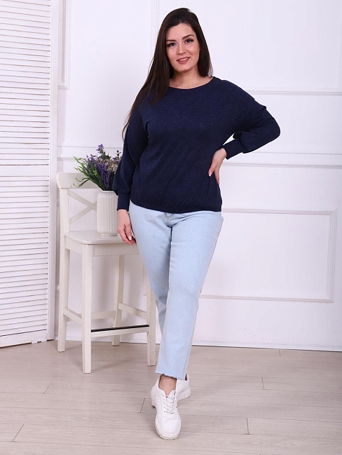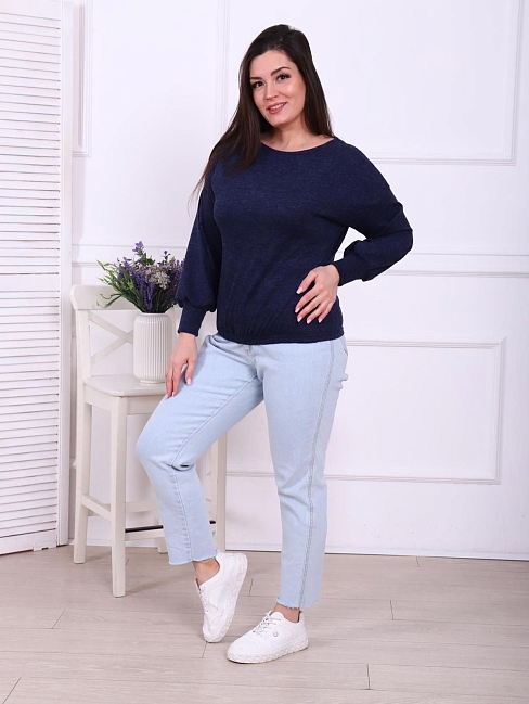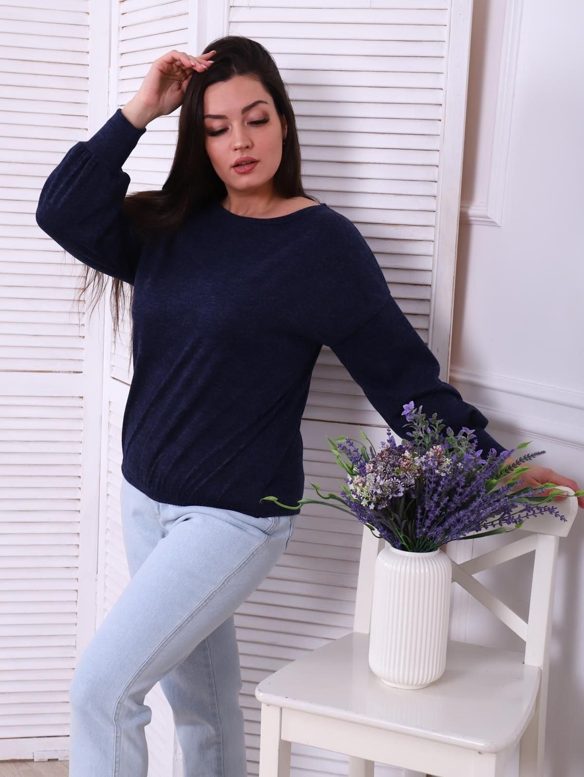 Женский джемпер Нота изготовлен из полотна "ангора". Модель свободного покроя, плечо спущенное, длинный рукав на манжете, низ джемпера на поясе.
