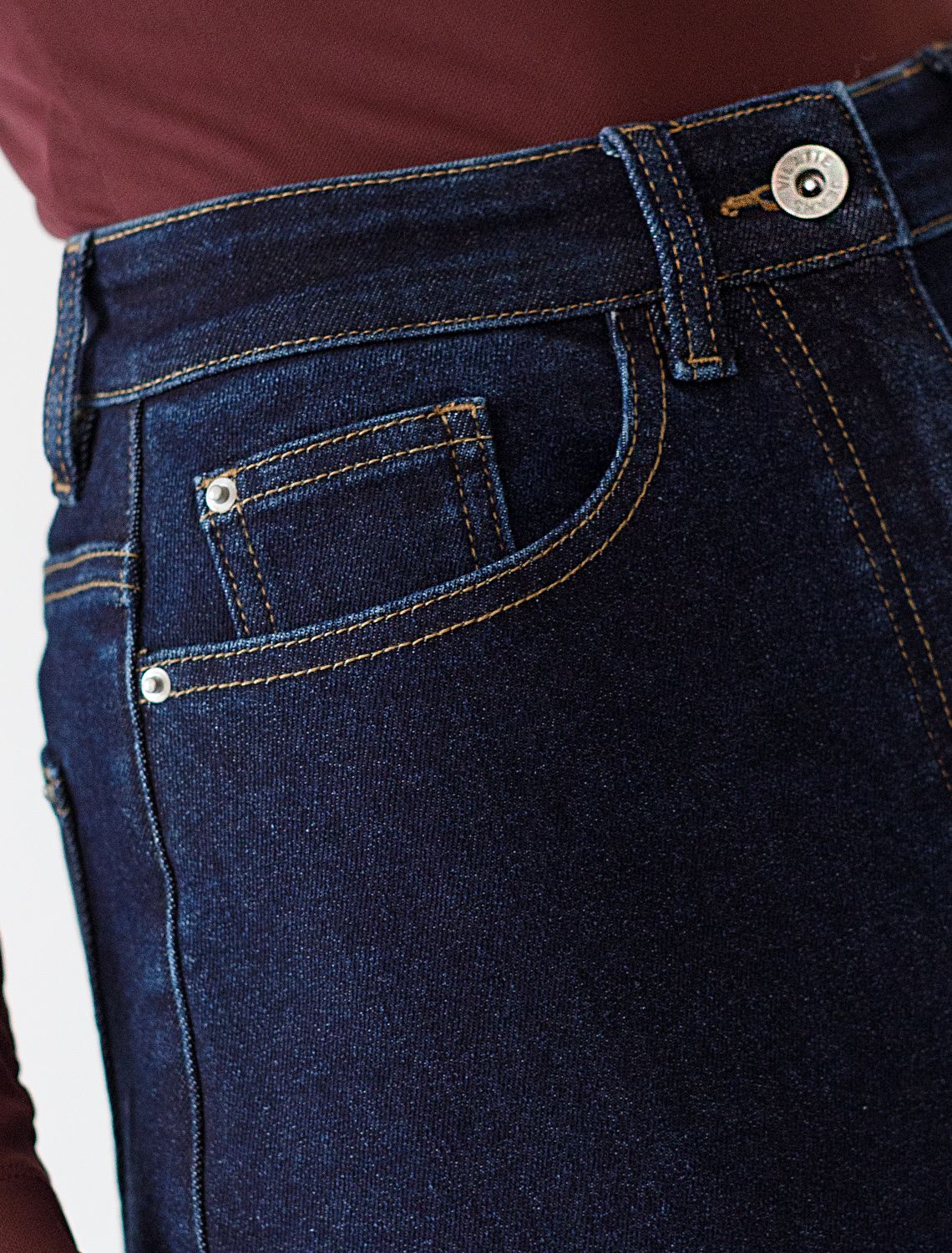 Классический силуэт, плотное облегание по бедрам. Спереди разрез-шлица. темно-синий