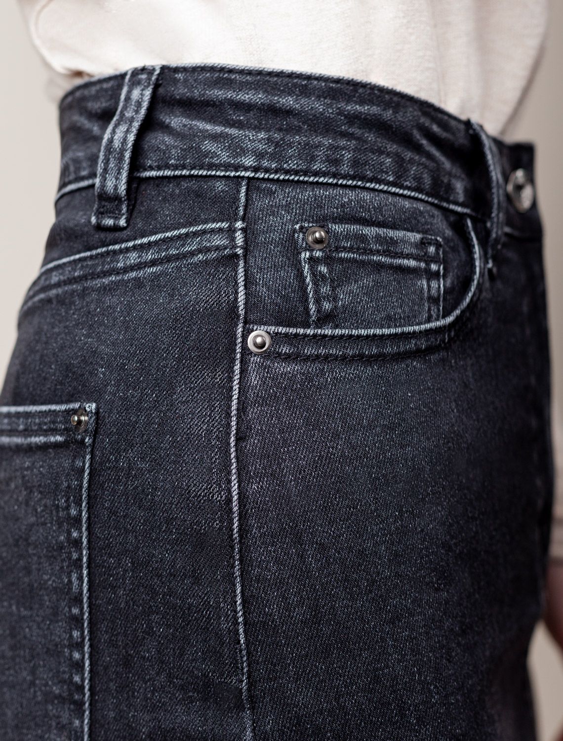 Удлиненная модель, прямого силуэта, с плотным прилеганием по бедрам. Высокий вырез спереди и классические джинсовые карманы спереди и сзади.