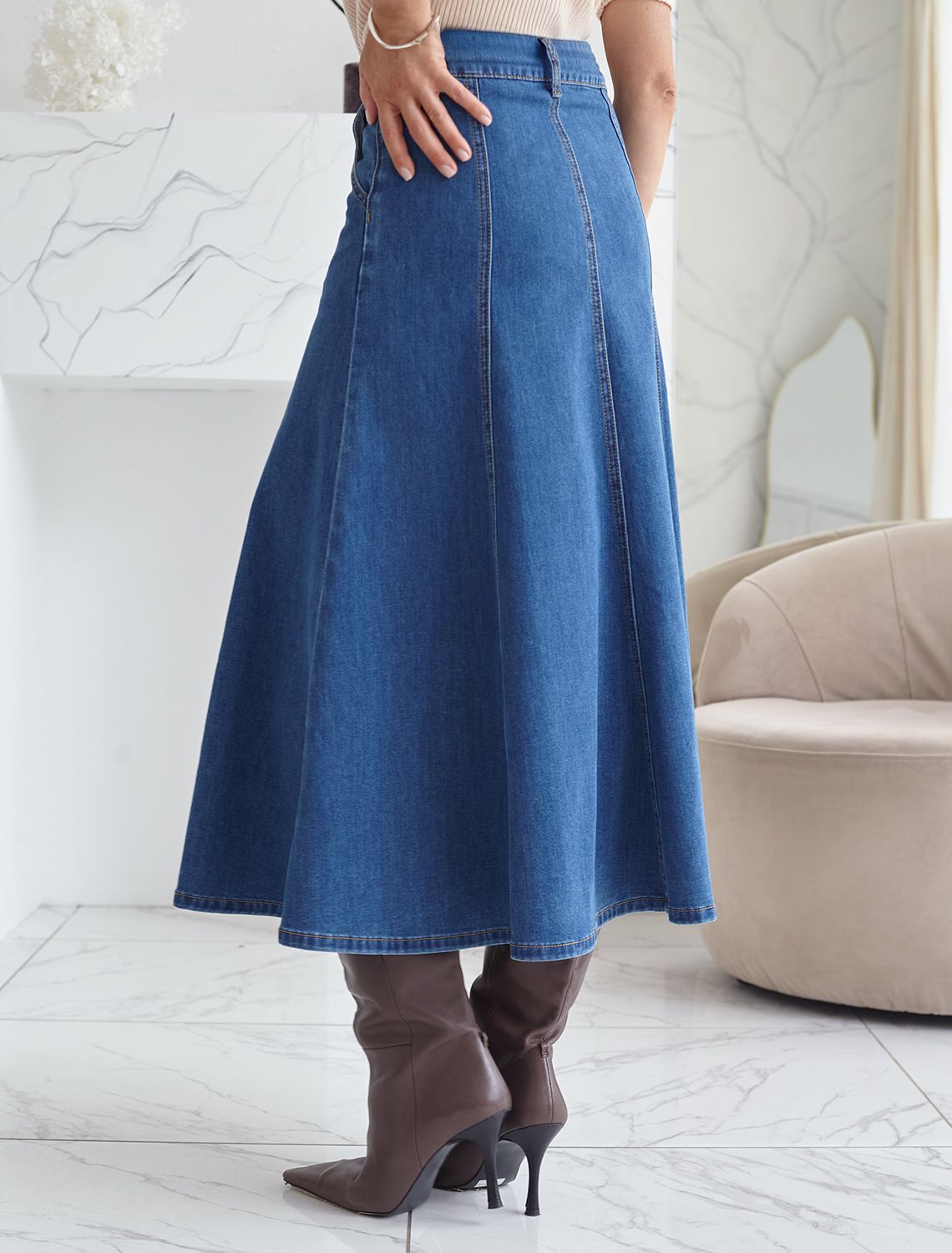 Джинсовая юбка миди А силуэта с декоративными швами из эластичного денима D56.121 синий