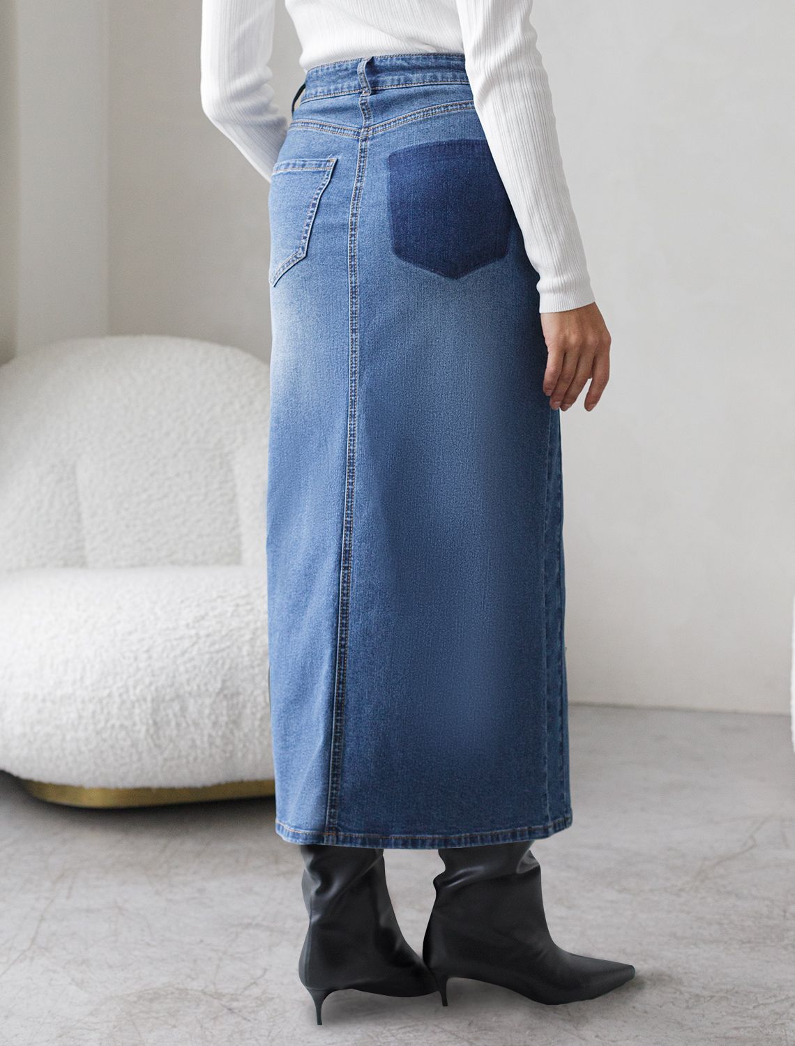 Джинсовая юбка миди с разрезом из эластичного денима