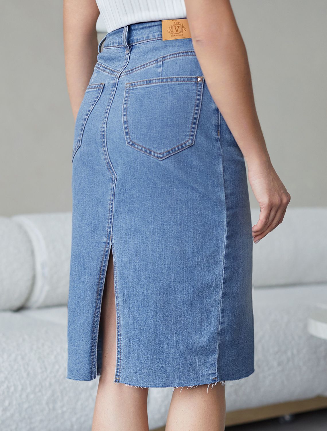 Эффектная джинсовая юбка синего цвета плотностью 12 OZ создана для тех, кто ценит стиль и комфорт в любое время года. Благодаря эластичному дениму модель отлично садится по фигуре и дарит свободу движений даже в жаркие дни. Декоративная стирка придает изделию современный вид, подчеркивая индивидуальность обладательницы и делая образ актуальным на весну и лето. Лаконичный разрез сзади добавляет оригинальности и визуально удлиняет силуэт, а длина чуть ниже колена делает эту вещь универсальной для самых разных случаев. Модель особенно удобна тем, что подходит на большие размеры, обеспечивая отличную посадку по фигуре без чувства стеснения. синий